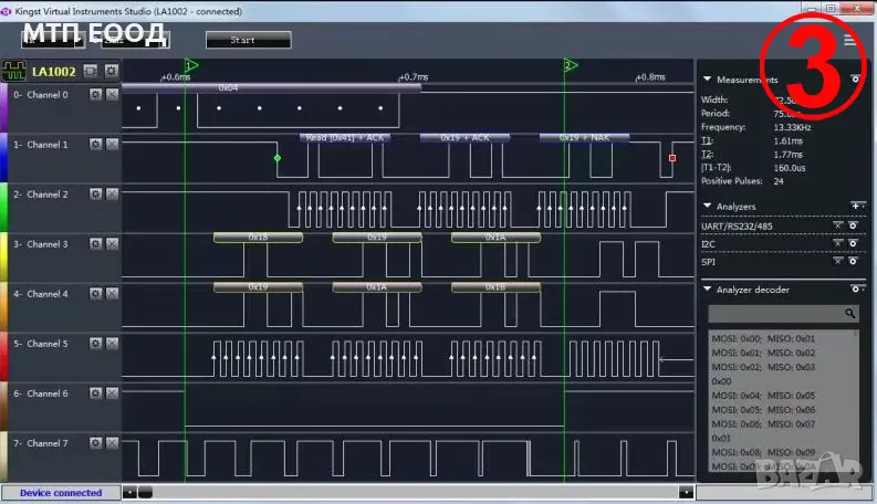 Поддържани протоколи: UART/RS-232/485, I2C, SPI, CAN, DMX512, HDMI CEC, I2S/PCM, JTAG, LIN, Manchester, Modbus, 1-Wire, UNI/O, SDIO, SMBus, USB1.1, PS/2, NEC InfraRed, Parallel и други