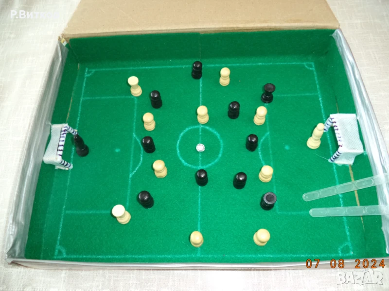 5. Футбол без пружинки. Самоделно направена игра с фигурки от шах, залепени върху ”терена” с разстопяемо лепило. Топчето е от станиол и се ”шутира” с пръчки за разбъркване на кафе от играча, до когото се намира най-близо. По този начин ”футболистите” могат да си ”подават”. Кутията е от друга игра и е със следи от употреба. Получавате и шаха, отскъдето са взети фигурите за футбола. (снимки 8 )- Цена 8 лв.