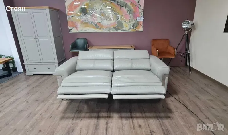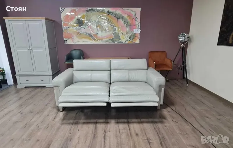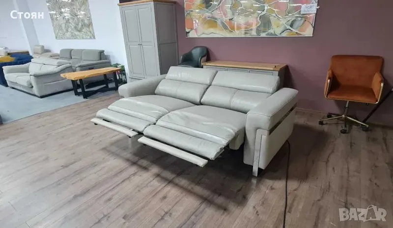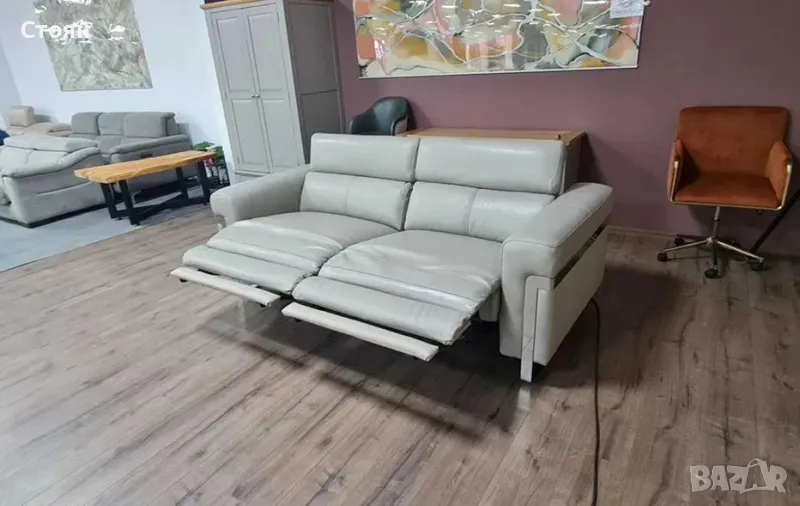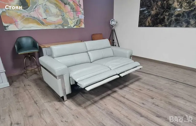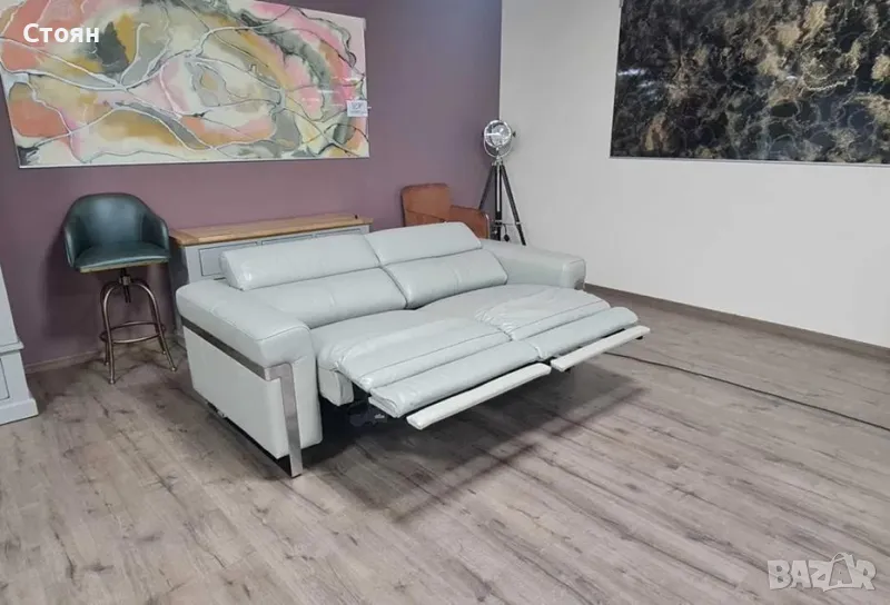 Сив кожен диван тройка "Moreno" с електрически релаксиращ механизъм за краката и подвижни облегалки.