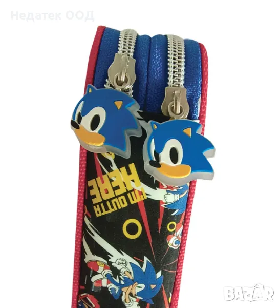 Ученически несесер червено син с 3D Sonic дизайн. Съдържа молив и син химикал, метална острилка, гума, 15 см права линийка и червена пластмасова отметка, 10 пастели и 10 маркера.