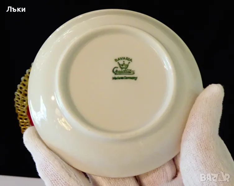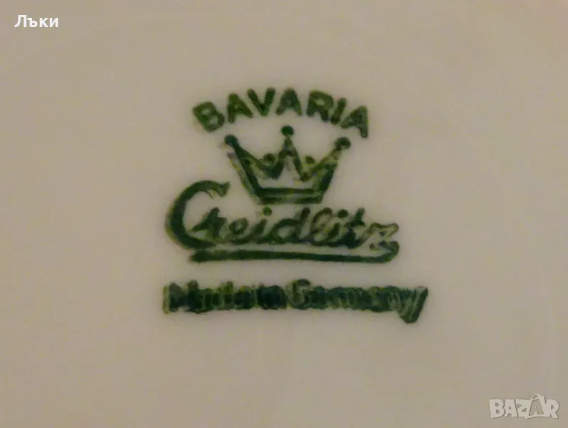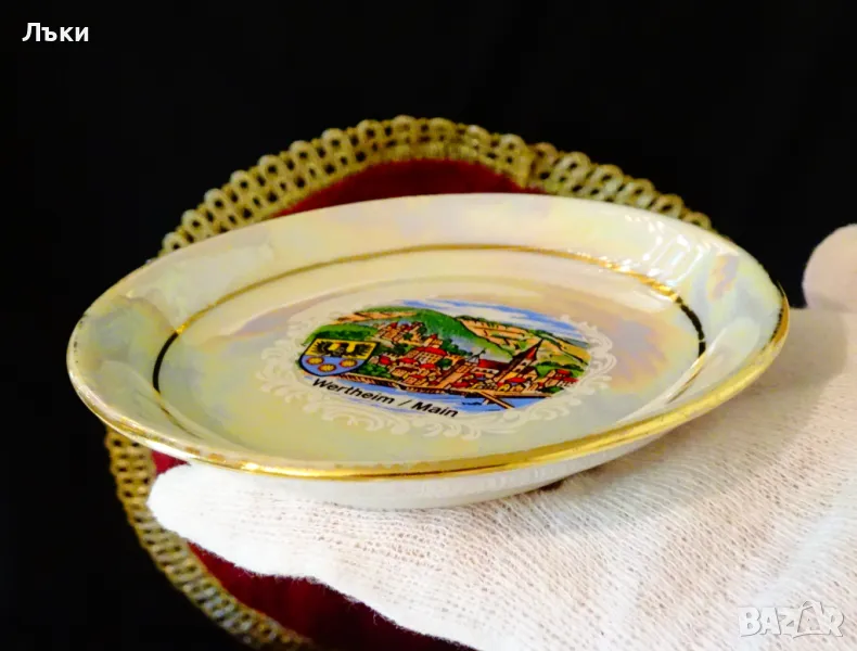 Чиния фин баварски порцелан Creidlitz,ръчно декорирана с изображение от град Wertheim и златни контури на фона на красив опалинов емайл,който променя цветовете си в