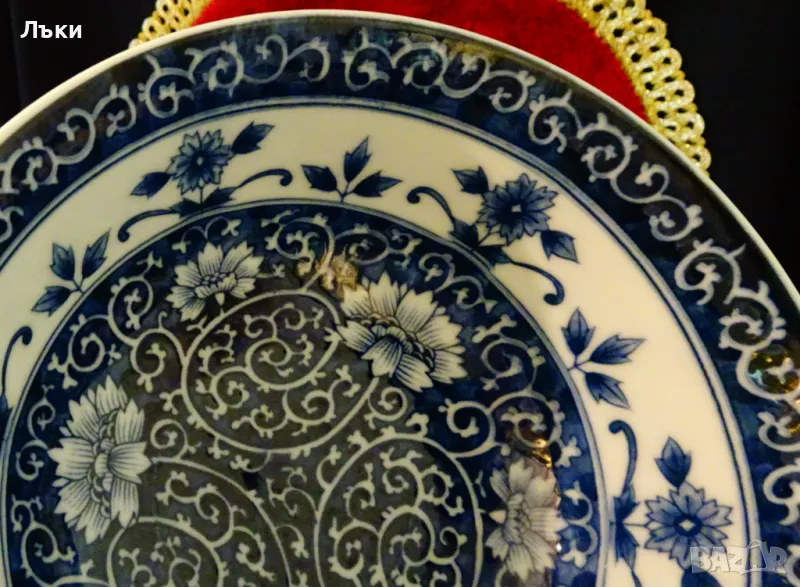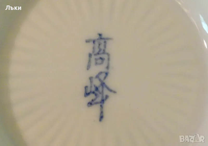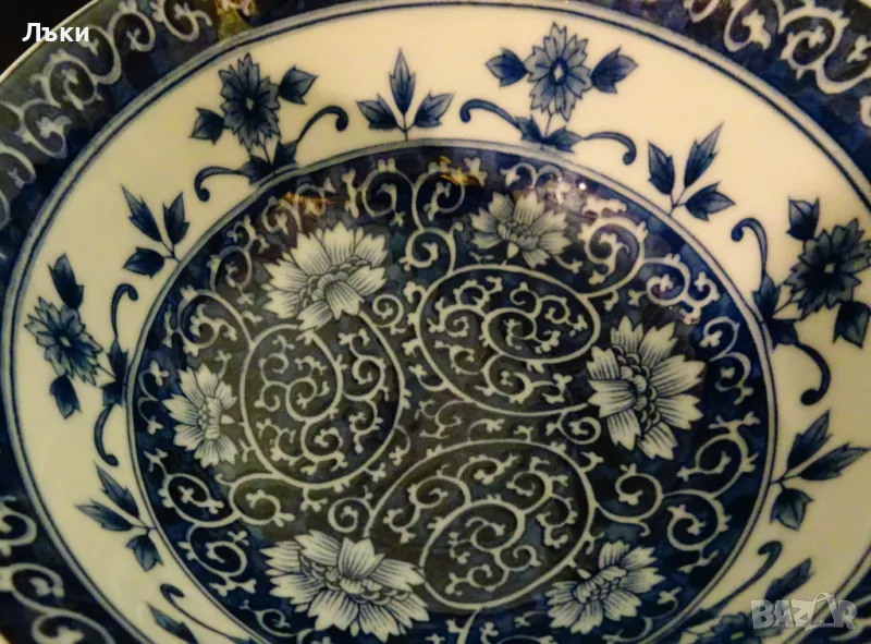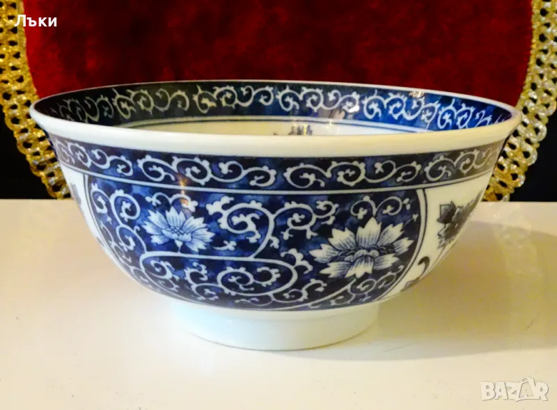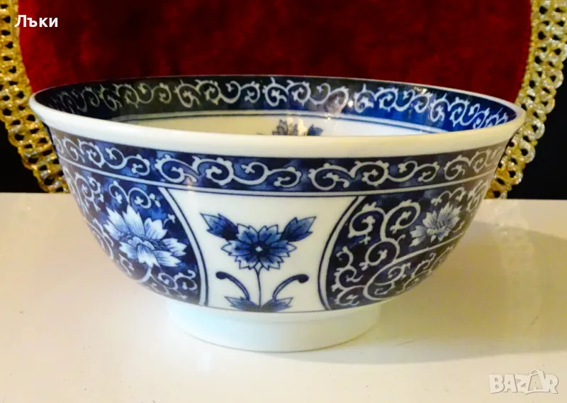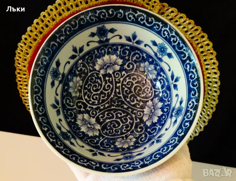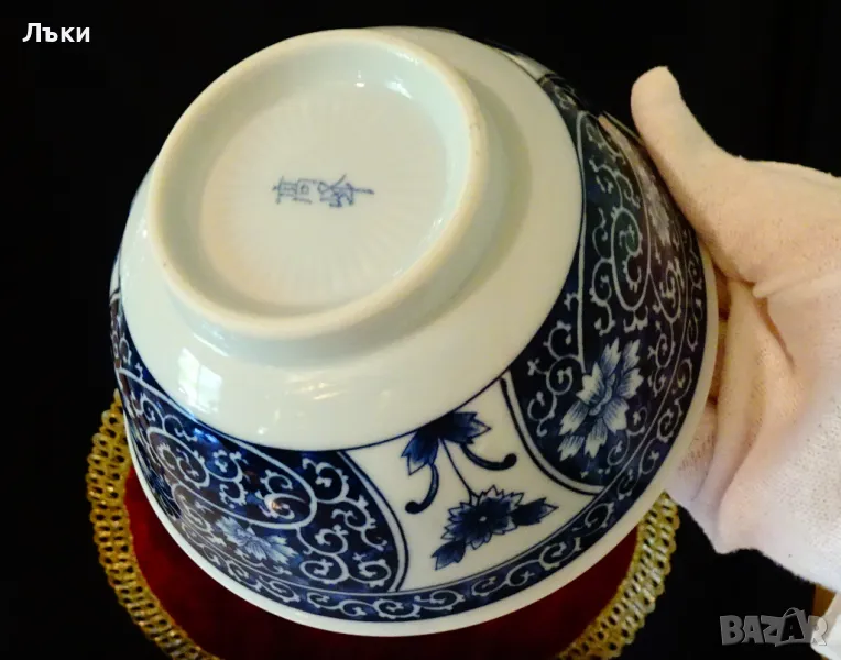 Старинна купа японски порцелан Arita,ръчно рисувана с божури,полски цветя и орнаменти в кобалтово синьо на бял фон.Маркирана като изделие с високо качество,датира от 1940 година.Диаметър 15 см.,височина 7 см.