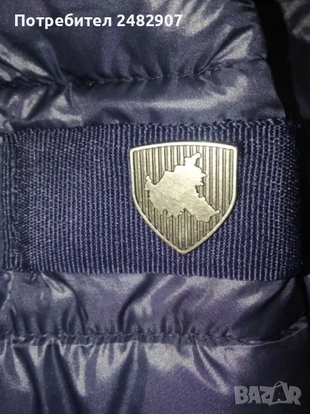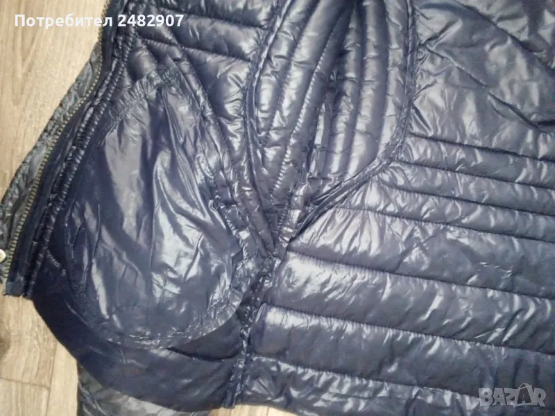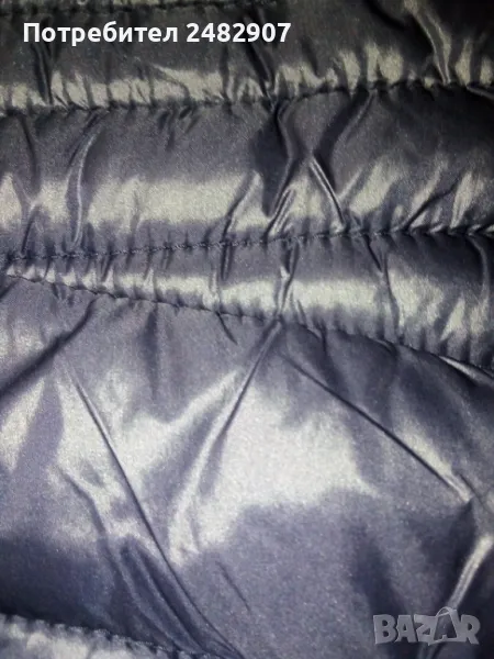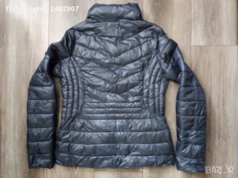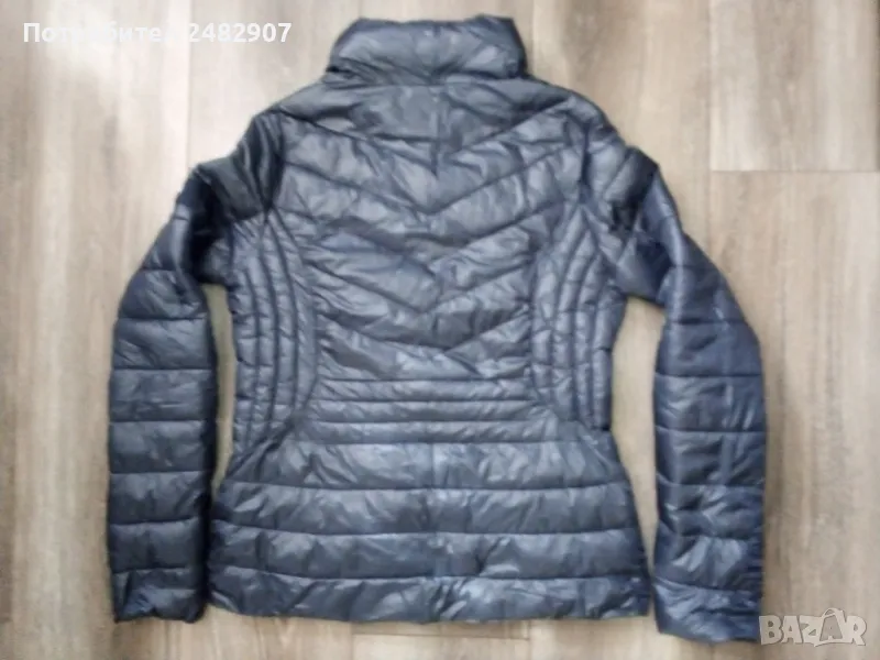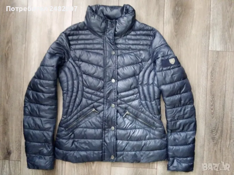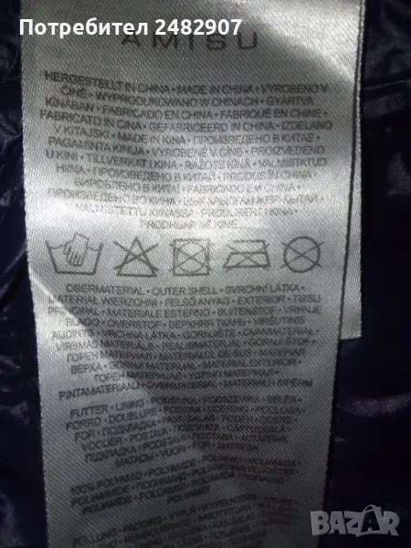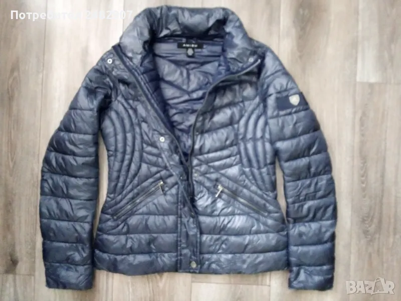 Тъмно синьо дамско яке "AMISU", размер 34. Съдържа 100 % полиамид/полиестер. Ширина в раменете - 38 см, ширина под мишниците - 47 см, ширина в долната част - 49 см, дължина от рамото до долу - 60 см, дължина на ръкава от рамото - 62 см, ширина на ръкава в долната част - 11,5 см. Много запазено, почти не е използвано, тънко, олекотено, капитонирано, без забележки.