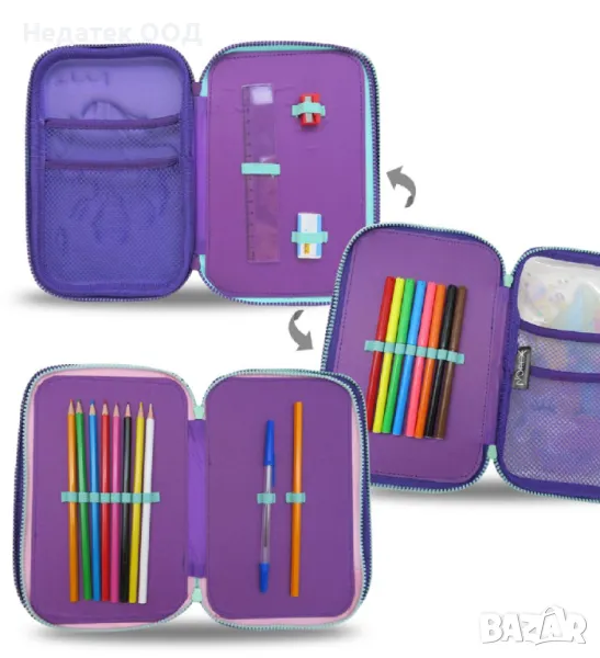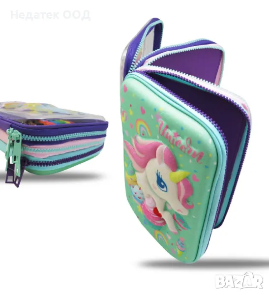 Ученически несесер троен в цвят тюркоаз/лилав с 3D дизайн на еднорог, прозрачен гръб и 2 вътрешни просторни джоба с мрежа. Съдържа молив и син химикал, пластмасова гума, гумичка, 15 см права линийка, 8 боички и 8 маркера.
