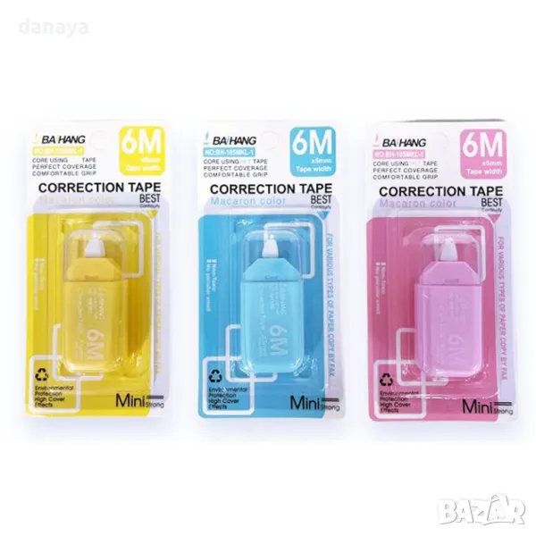 Коректор за хартия в мини корпус с различни нежни цветове. Коректор лента, подходящ за обикновена, копирна и факс хартия.