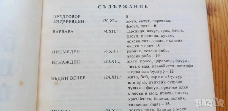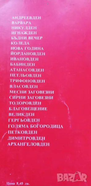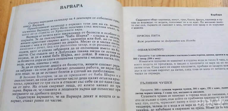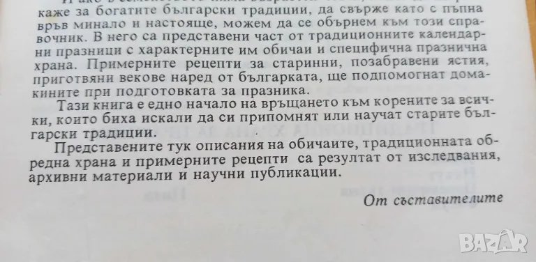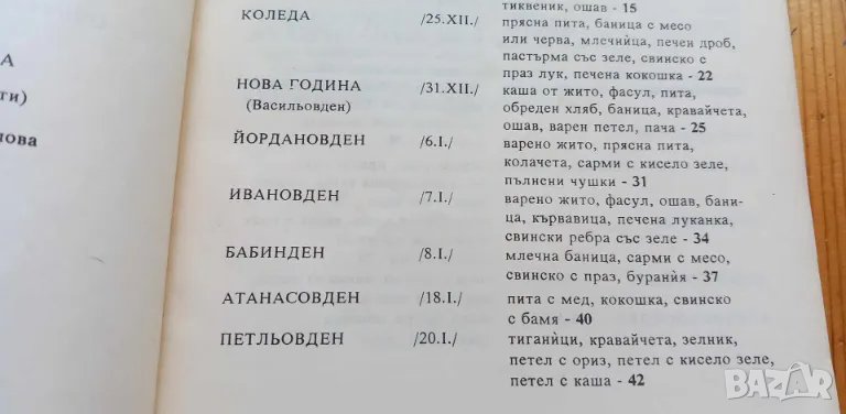 Книгата е издадена през 1991г, меки корици, съдържа 90 страници с традиционни готварски рецепти за Андреевден, Варвара, Никулден, Игнажден, Бъдни вечер, Коледа, Нова година, Йордановден, Ивановден, Бабинден, Атанасовден, Петльовден, Трифоновден, Власовден, Местни заговезни, Сирни заговезни, Тодоровден, Благовещение, Великден, Гергьовден, Голяма Богородица, Петковден, Димитровден, Архангеловден.