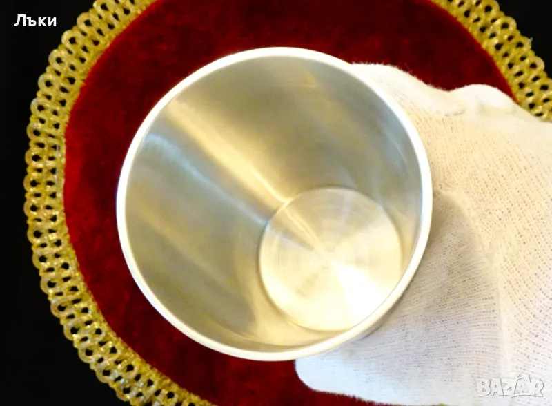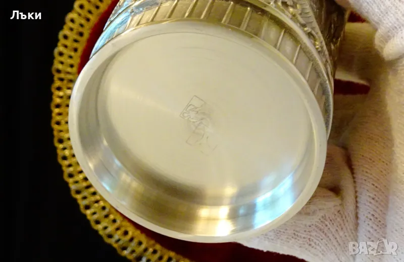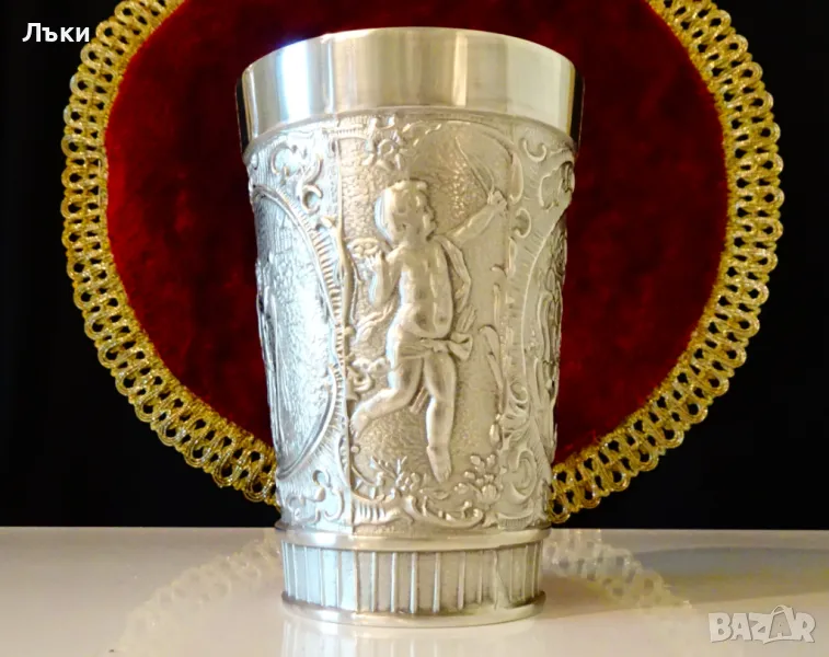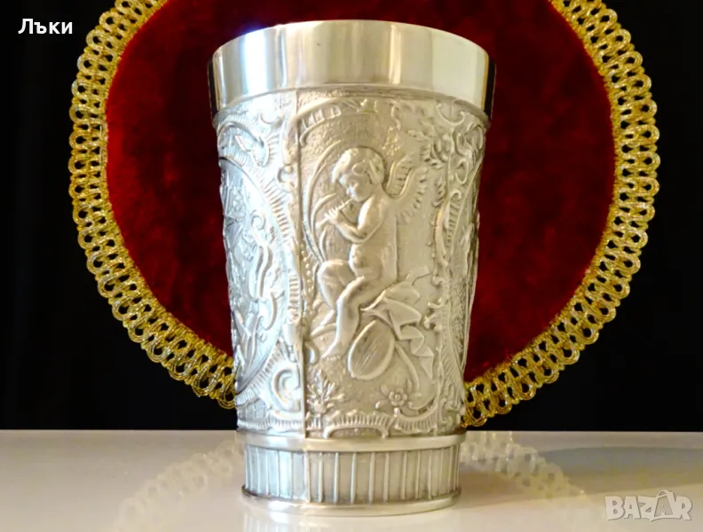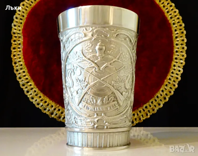 95% калай и 5% сребро,маркирана.Декорирана с релефно изображение на глашатай с кон,две ангелчета – едното стреля с лък,а другото свири на флейта,младия Бог Дионис,герб на ловците и красиви орнаменти.Високо качество,масивност със
