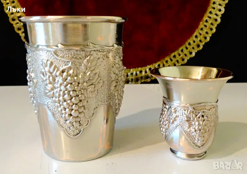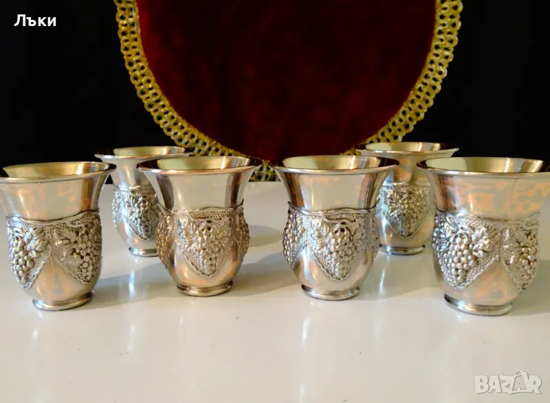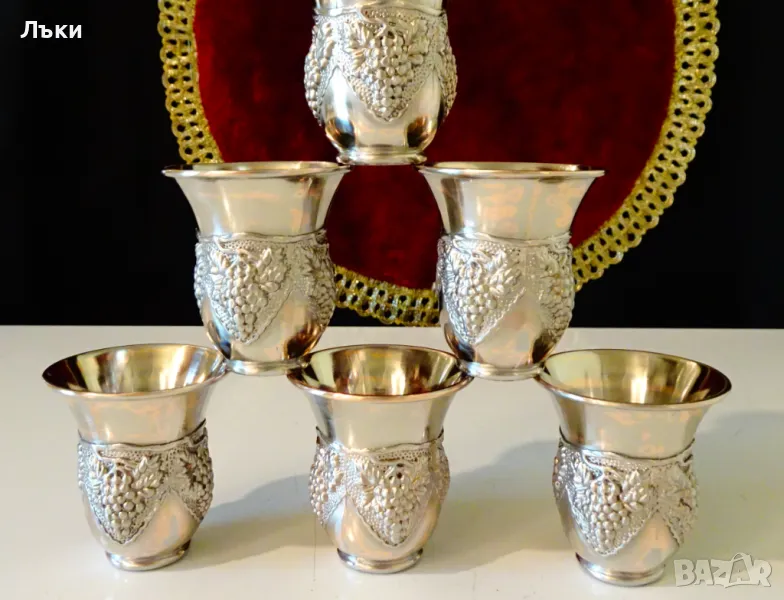 масивна мед с посребряване.Декорирани с релефно изваяни лози с грозде.Звънят като камбанки.Височина 5.5 см.,диаметър 5 см.,тегло на всяка 80 гр.Вместимост 50 мл.Налични 6 броя,цена 16 лв.,за брой.