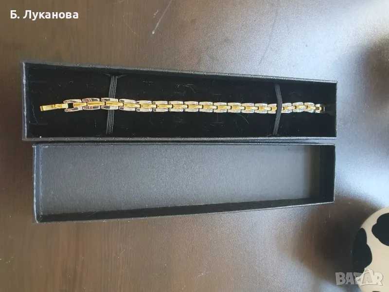 Гривната е нова, несполучлив подарък, 200 мм дължина, 14 мм ширина. Титанова сплав с вградени магнити, регулира кръвното налягане, премахва главоболие, безсъние, умора, повишава имунитета.