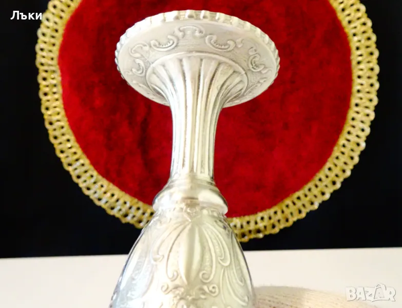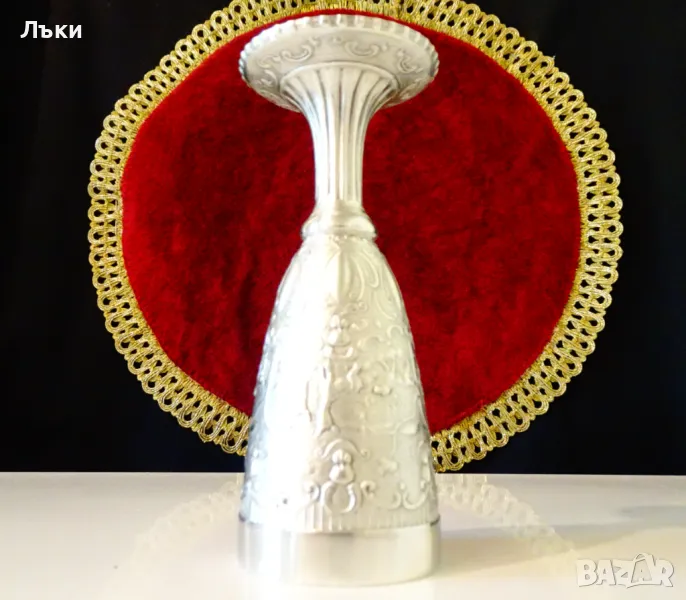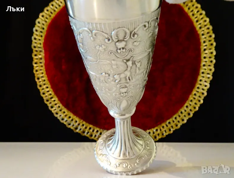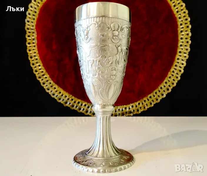 ръчна изработка от 95% калай и 5% сребро,маркиран.Представя ловна сцена с релефно изображение на ловно куче,елени,сърни и кошути спотаени в гората.Над тях е изобразено ангелското лице на Бог Дионис,който освен покровител на виното е и божество на възраждащата се природа.Тази живописна картина е декорирана с красиви ренесансови орнаменти.Бокала е изключително масивен и изглежда като сребърен.Височина 12 см.,диаметър 5 см.,тегло 170 гр.Вместимост 120 мл.