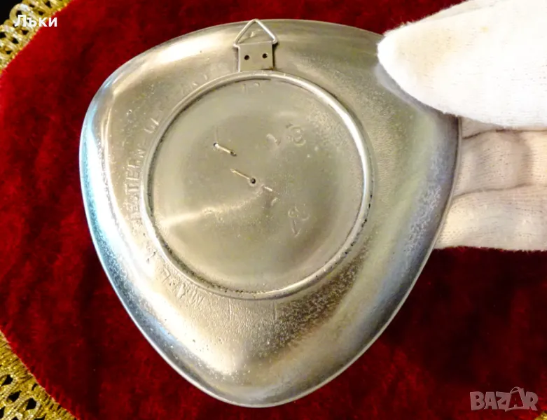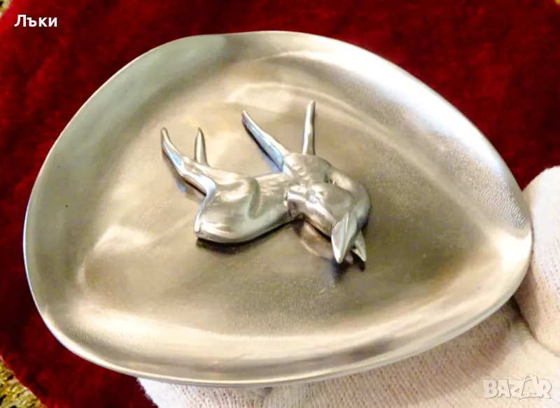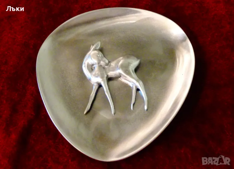 калай,маркирано.На плоскост с лек релеф и триъгълна форма е стабилно захваната отделна фигура на Елен,Кошута.Изключително качество о масивност.Има окачалка за стена.Диаметър 12.5 см.,височина 1.5 см.,тегло 250 гр.