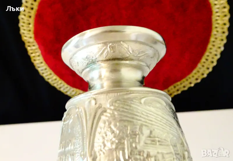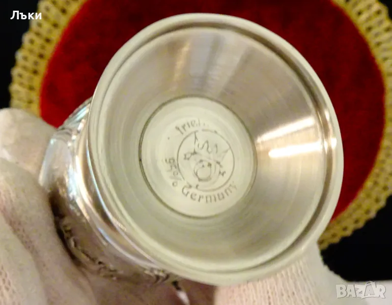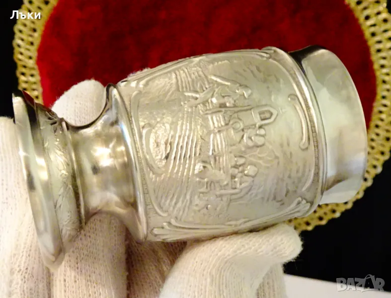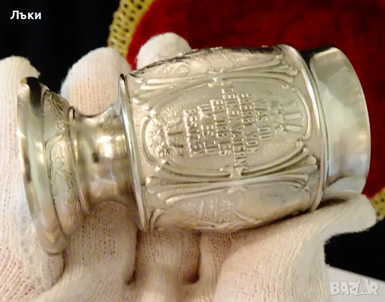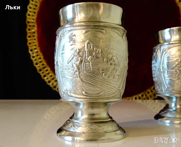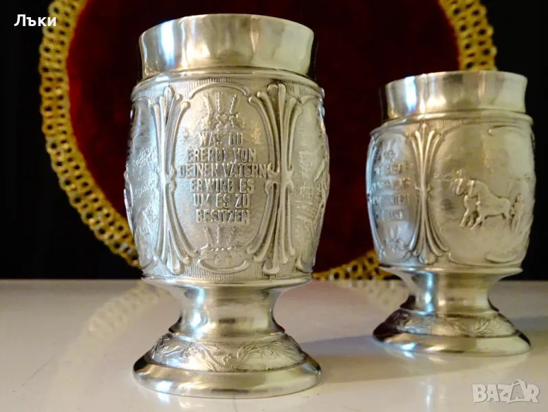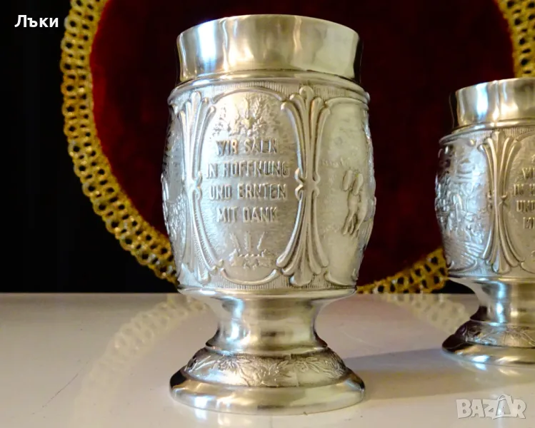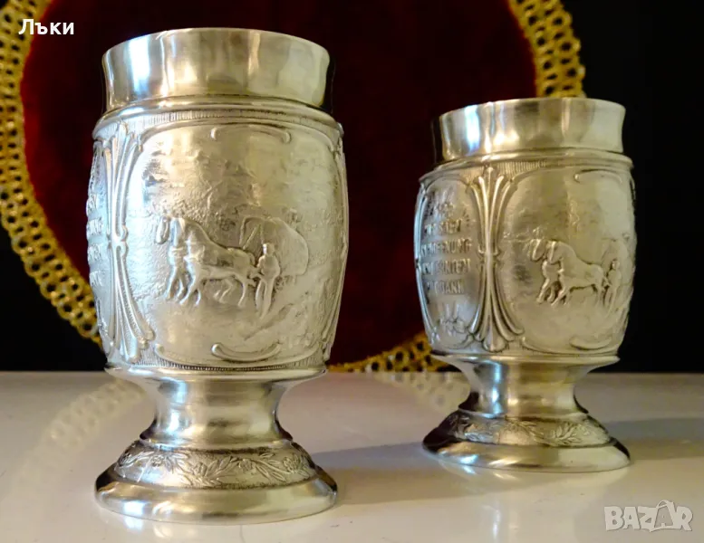 Западно Германски чаши за ракия,ликьор,майсторска ръчна изработка от 95% калай и 5% сребро,маркирани със знак за високо качество.Декорирани с две релефни картини,изобразяващи Сиетба и Жътва.Между тях има два релефни надписа,които гласят: