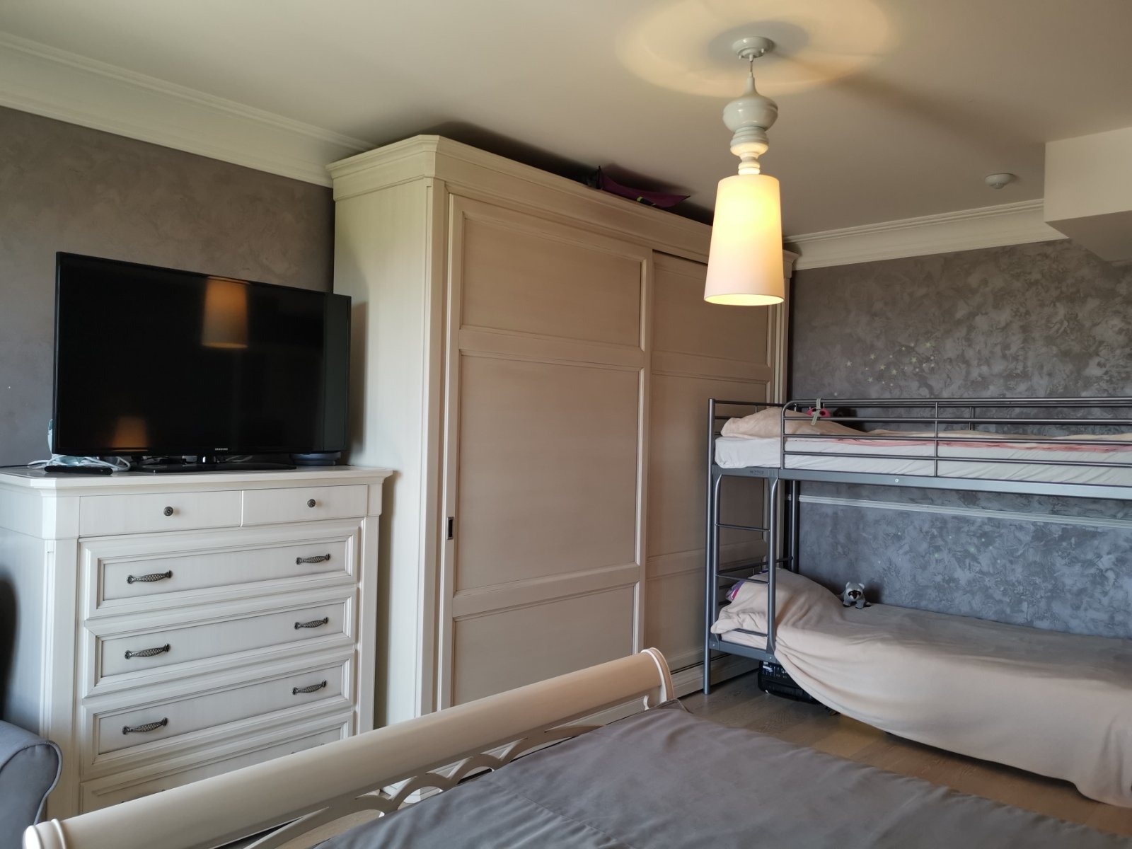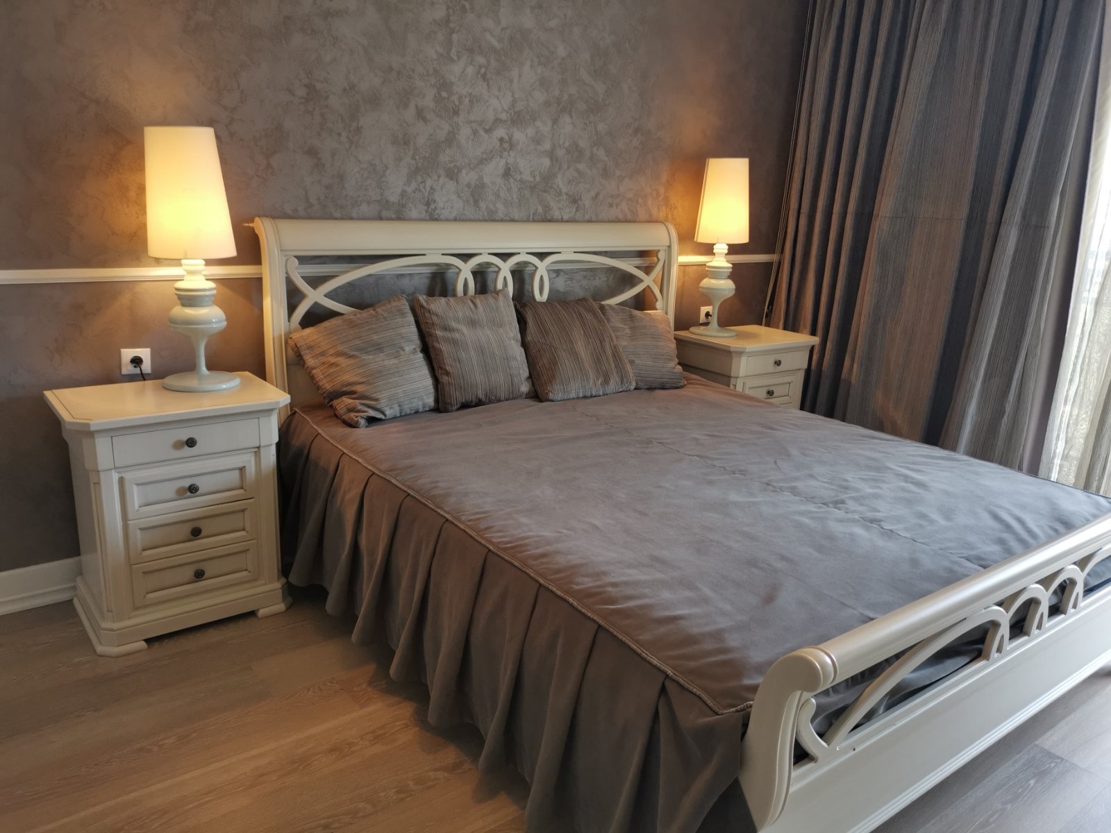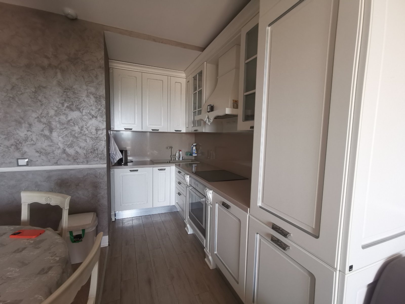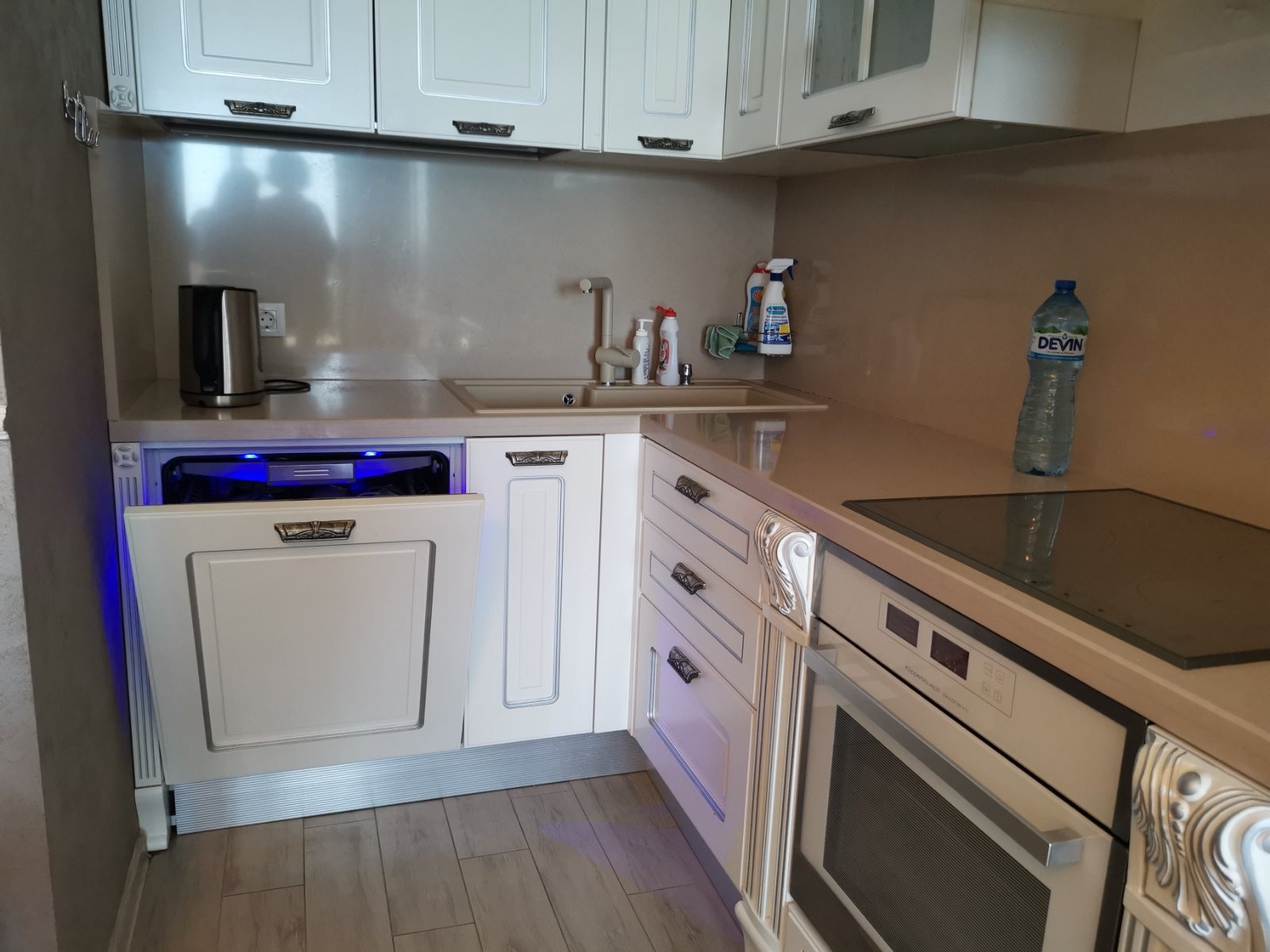 - подовите настилки в дневната и спалнята са естествено дърво, а в кухнята е гранитогрес.