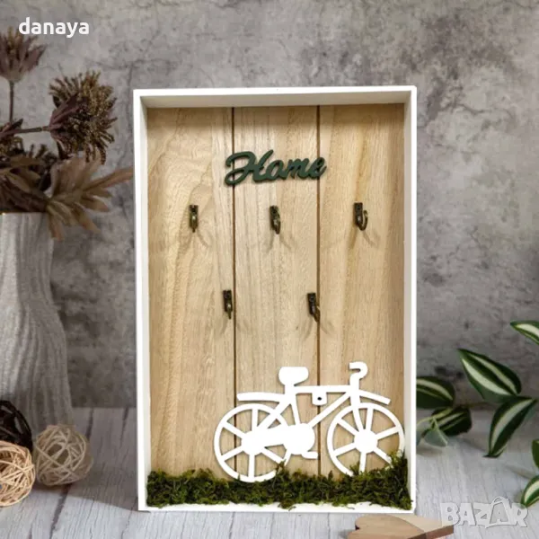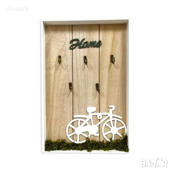 Дървена поставка за ключове. Декоративна къщичка за ключове с декорация бял весолипед върху зелена тревичка. Кутията има 5 кукички за закачане за ключове или дребни аксесоари. В горната си част има надпис Home. Закачалка за ключове, която ще се превърне в красив декор за всеки дом!