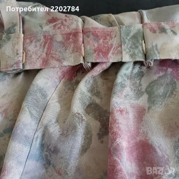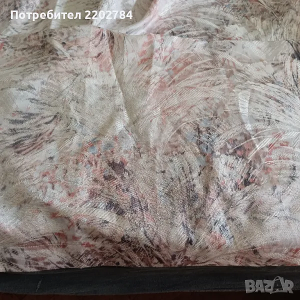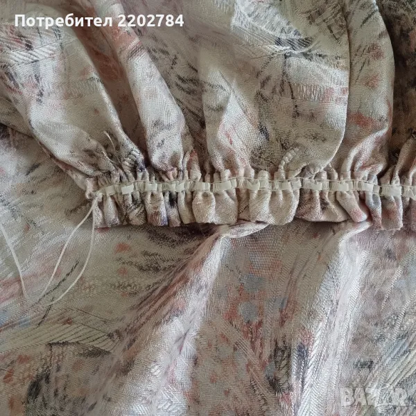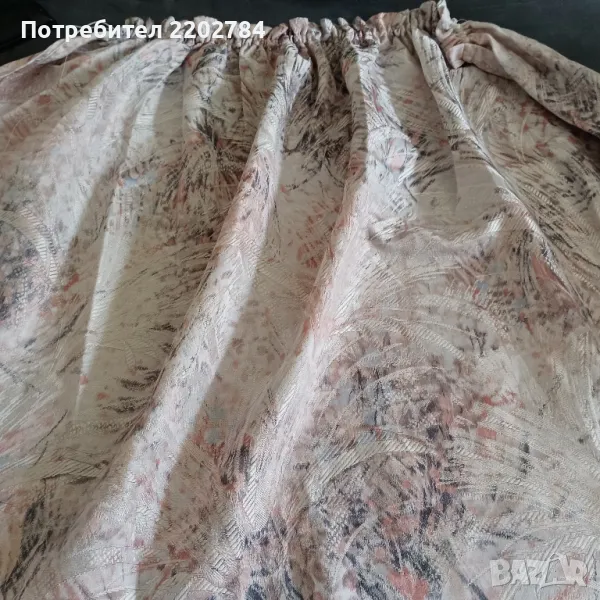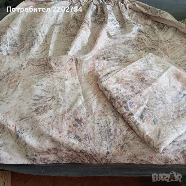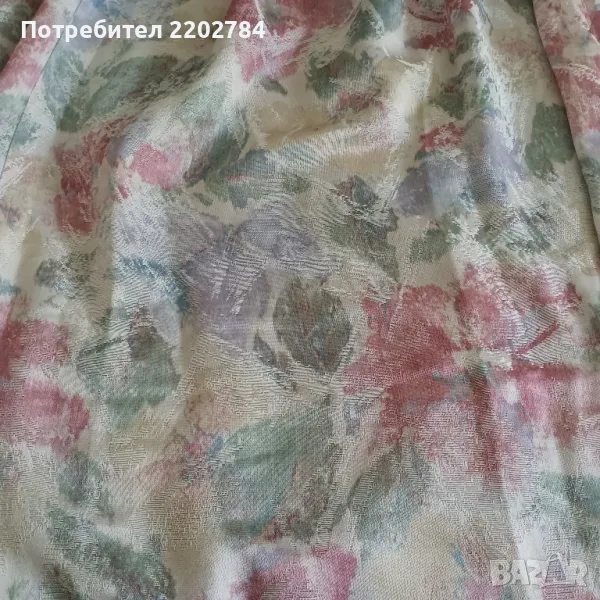 пердета от плътен сатен в нежни пастелни цветове.Фиксирана ширина в горната част и имат пластмасови кукички.Без забележки.Размер на едното: ширина в горната част 75см, ширина в долната част 170см, дължина 160см.