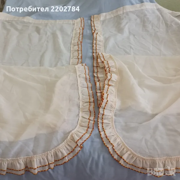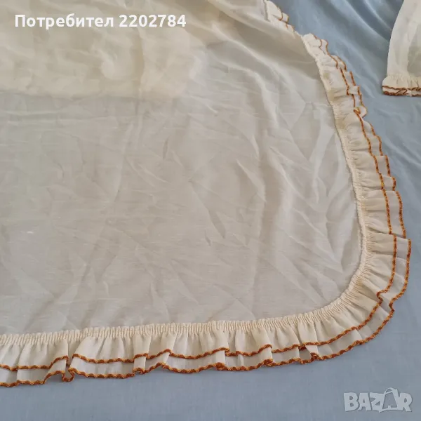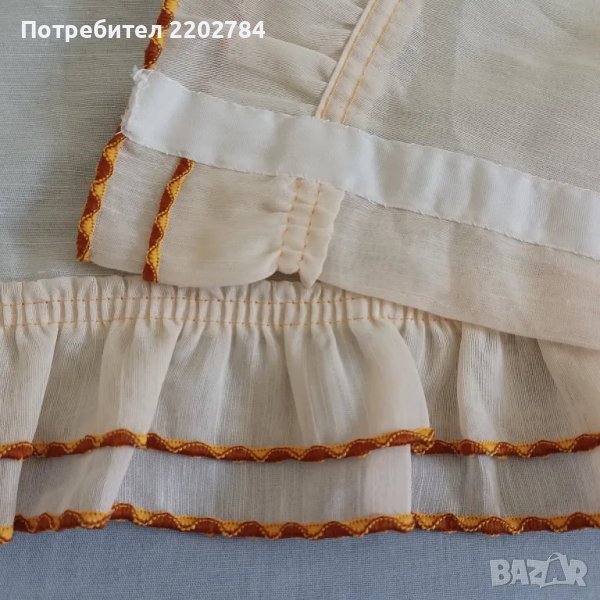 Последния комплект е от две пердета цвят шампанско с красиви двойни къдри по едната страна на дължината и ширината.Къдрите са обточени с тънък, нежен ширит в кафяво и оранжево.В горната част са с пришит ширит,върху който да се пришият копчета за корниз.Много красиви и без забележки.Размер на едното: ширина 95см, дължина 215см.
