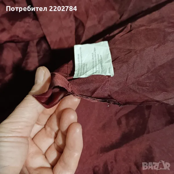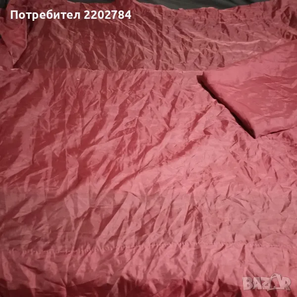 Третия комплект е от две пердета,воал в тъмно бордо за нанизване на тръбен корниз.Едното перде има две миниатюрни точици(на последната снимка) При поставяне не се забелязват,защото са малки.Размер на едното - ширина 140см, дължина 200см.
