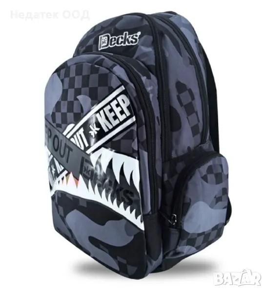 Ученическа раница в черно сиво с дизайн на зъби от акула и надпис „Пазете се“. Има 2 големи джоба и 1 малък, джоб с цип и неопренов подплатен страничен джоб, мек анатомичен гръб, джоб за лаптоп, органайзер, калъф за очила? и светлоотразителни ленти. Идеален за ученици от началното училище и тийнейджъри.