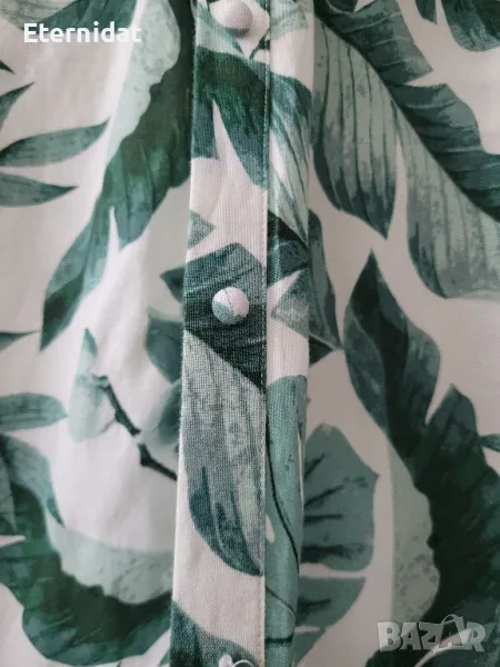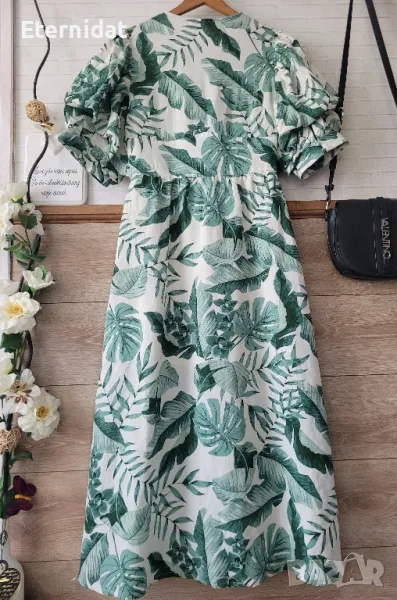 Уникално красива рокля в така любимият принт бяло на зелени листа . Цялостно предно закопчаване копчета, ефектен ръкав, разкроена.