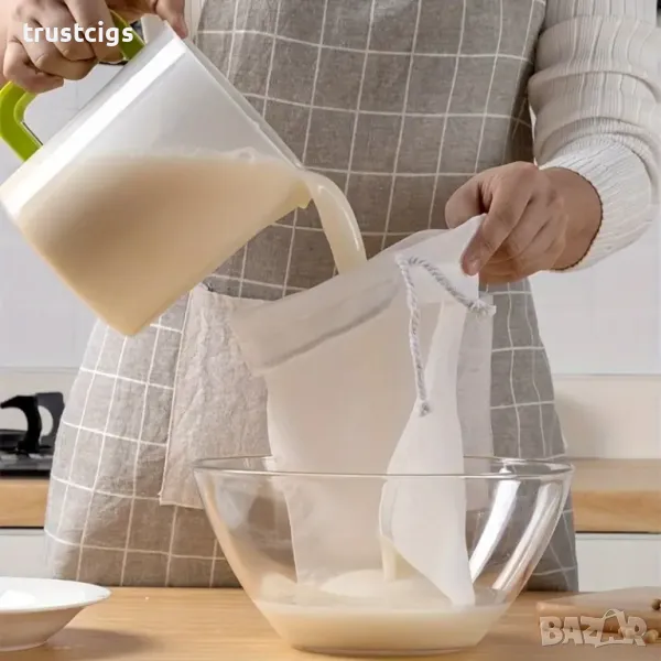 Инвестирайте в здравословно и устойчиво бъдеще с нашата торбичка за отцеждане! Изработена от най-висококачествени материали, нашата торбичка е проектирана да издържи на ежедневна употреба. Фината мрежа с микроскопични отвори гарантира перфектно филтриране и гладка текстура на вашето растително мляко. Освен за приготвяне на мляко, торбичката е идеална и за: