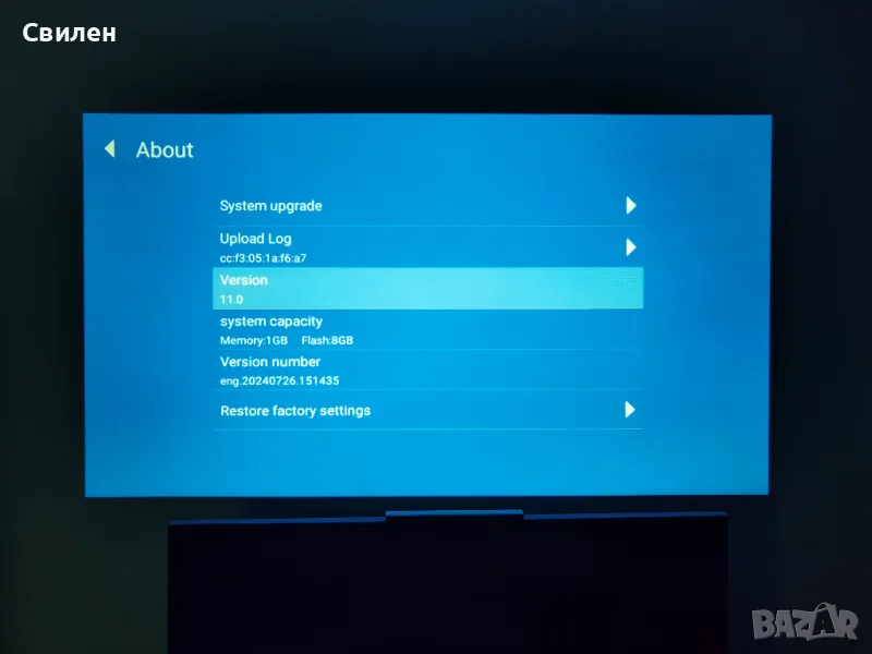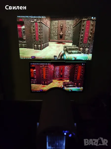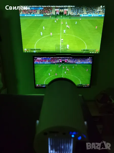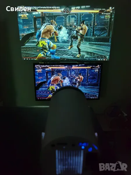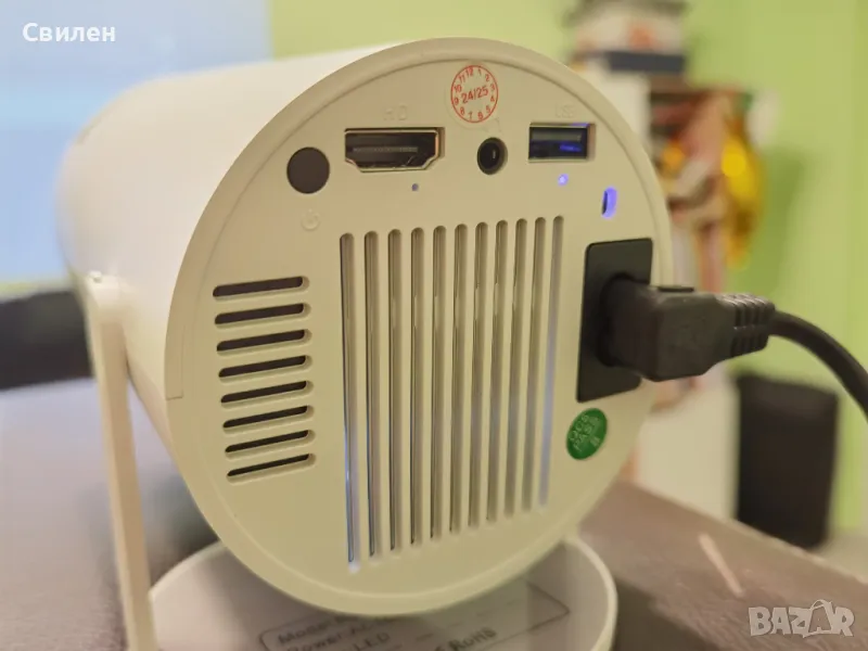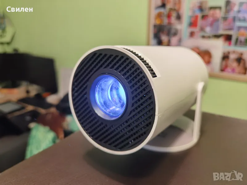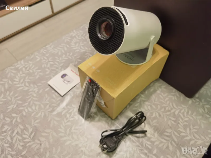 Проекторът е чисто НОВ. Пускан за снимките. Купуван е от ebay , но така и не влезна в употреба, защото имаме по-скъп модел. Има операционна система Андроид 11 и могат да се гледат видеа от Youtube , Netflix и т.н, да се инсталират ваши приложения от PlayStore и да се стриймва видео картина от телефона или от компютъра директно по WiFi. Картината може да става от 40 до 130 инча.