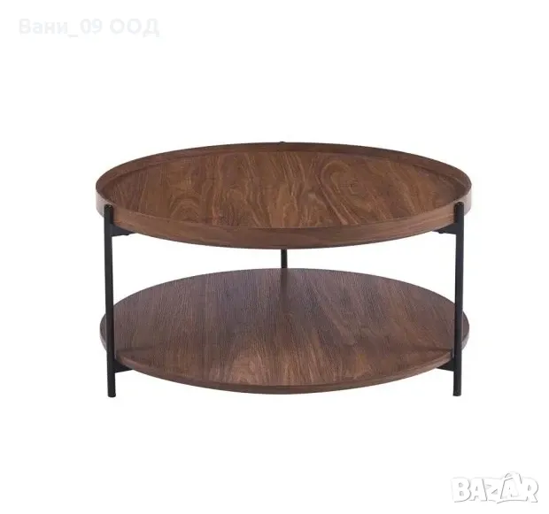 Масата е проектирана и изработена с 2 кръгли плота в цвят орех за поставянето Вашите любими книги и списания и 3 метални крачета, които разчупват дизайна, придават устойчивост на конструкцията и допълват визията й.