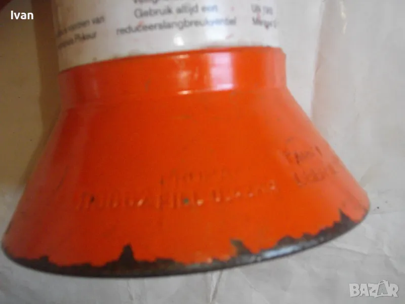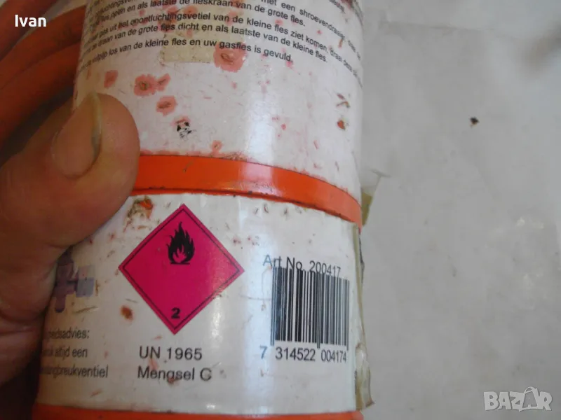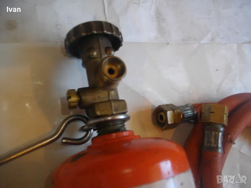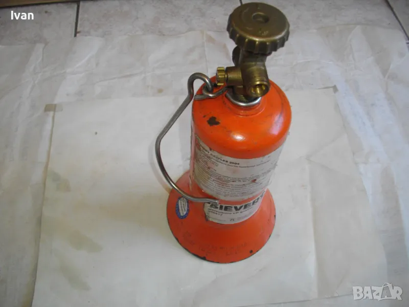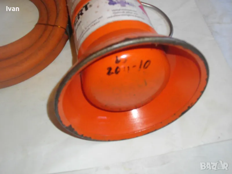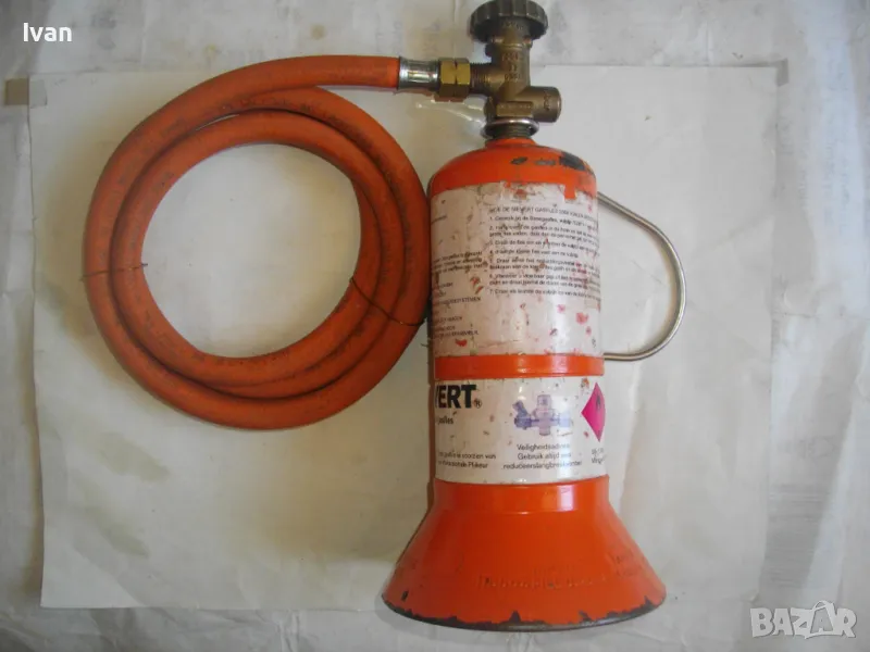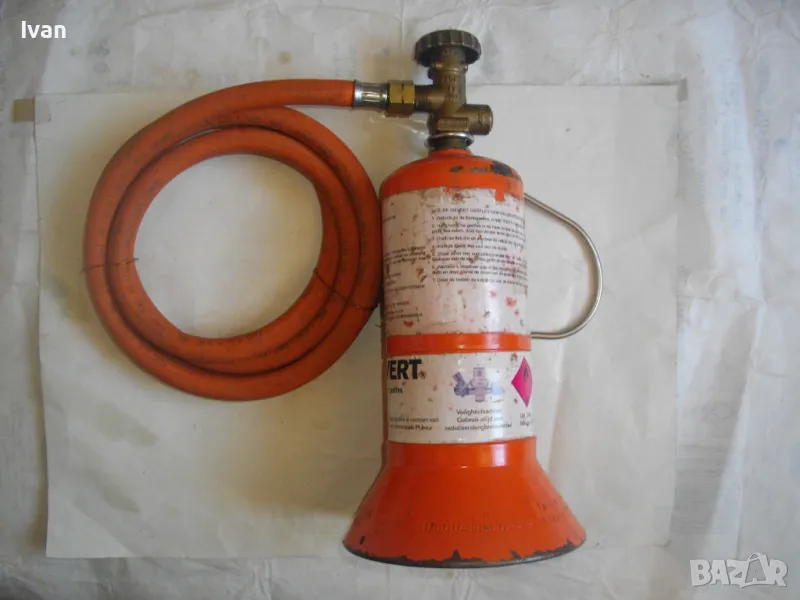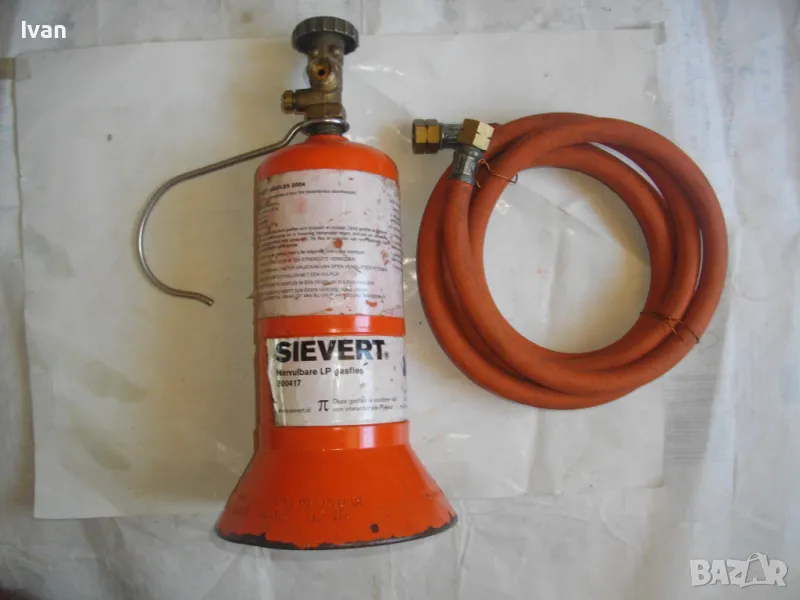 ОПИСАНИЕ на бутилка малка италианска на газ и маркуч. Цена 139 лв. Бутилката е почти нова, марка италианска професионална промишлена индустриална SIEVERT GASFLES 2004. Характеристики - 30 см, 0,42 кг., в напълнено състояние -1,77 кг.За налягане до 30 бара. Метална. Със бронзова глава и бронз спирателен кран. Стоманена кука за окачване. Поставен почти нов итал.маркуч 2 м.