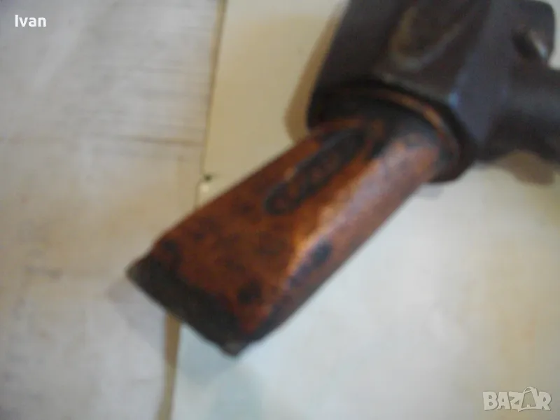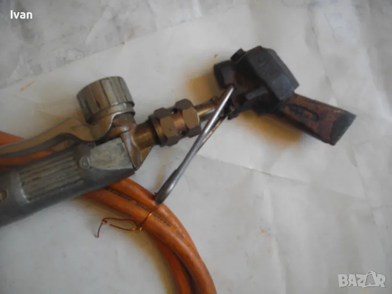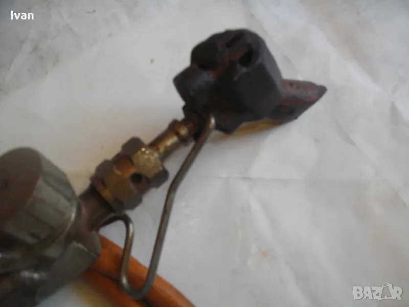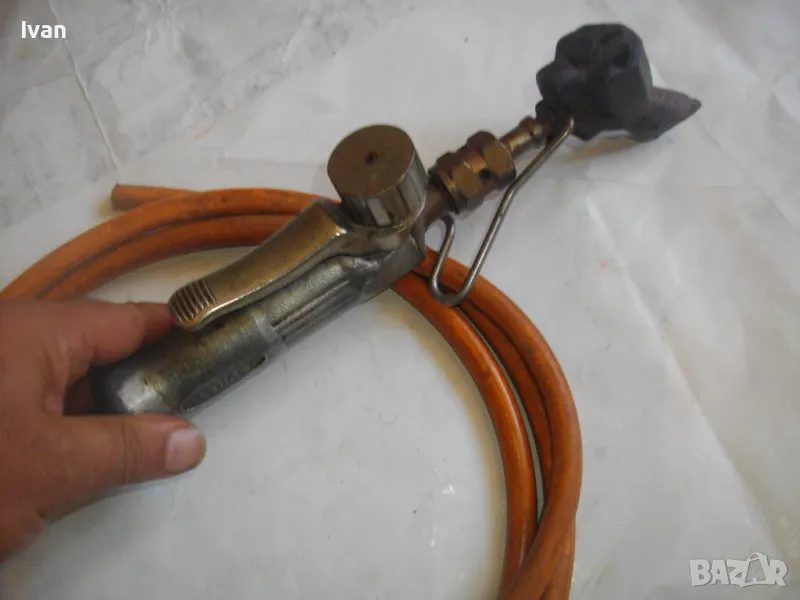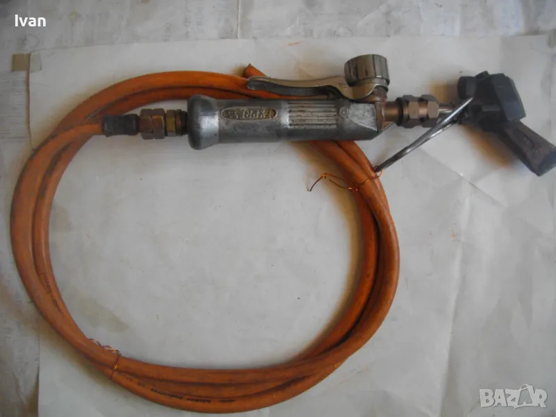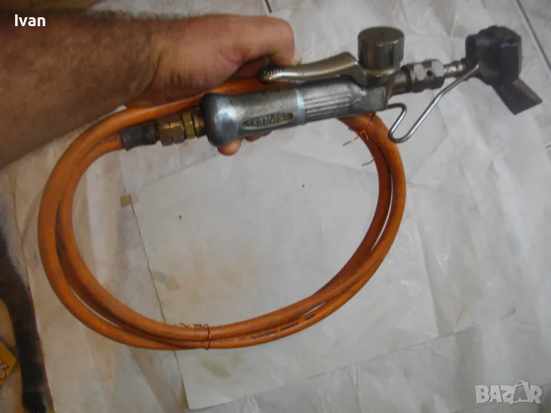 поялник 280 мм за газ пропан.бутан - сив цвят, с маркуч 4 м и редуцир вентил оригинален. Със спусък и спирателен кран, метална вградена подпорна стойка за самостоятелен стоеж и редуцир вентил. Алуминиев. Немски или френски. Марка маркирана - EXPRESS. Сива, удобна алуминиева дръжка. с бронзово тяло и присъединителна бронзова глава за поялника. Спусък и спирателен кран - бронзови. Дължина на поялника - 280 мм. Човка поялника - масивна широка - 25 мм. Метална стойка за самостоятелен стоеж - вградена. Отлично техническо/работно състояние. Леко захабен външен вид /поляника е ползван при хидроизолации напокриви и има по него бегли следи от смолести инертни материали/. Масивен горен върток. Марка на медната човка - EXPRESS. Присъединен маркуч към поляника на щуцер резбови и метална стягаща маркуча скоба. Дължина на маркуча - 4 м. Тегло на целият комплект от поляник/маркуч/вентил - 2,5 кг.