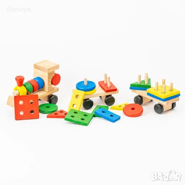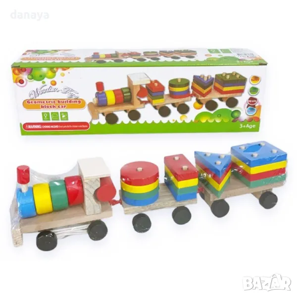Дървеното влакче с дървени части под формата на геометрични фигури, красиво оцветени, в ярки, привличащи окото цветове.