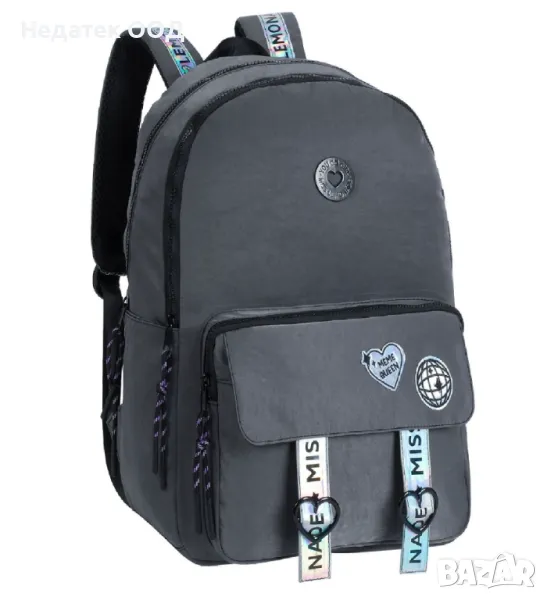 Сива ученическа раница с холографски презрамки на гърба, серия Miss Lemonade, с 1 голямо отделение с отделение за лаптоп, 1 по-малко предно отделение, голям преден джоб със сърце с цип и 2 странични джоба. Има анатомичен гръб, меки презрамки и метални ципове в черно. Идеален за ученици от началното училище и тийнейджъри.