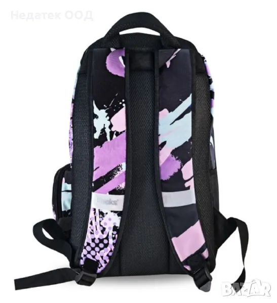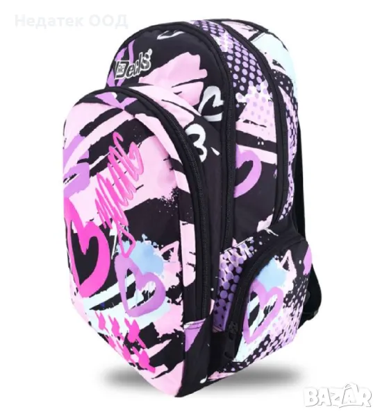 Черна ученическа раница с цветен дизайн и сърца в цвят фуксия и люляк и черен ключодържател с помпони. Има 2 големи джоба и 1 малък, джоб с цип и неопренов подплатен страничен джоб, мек анатомичен гръб, джоб за лаптоп, органайзер, джоб за очила и светлоотразителни ленти. Идеален за ученици от началното училище и тийнейджъри.