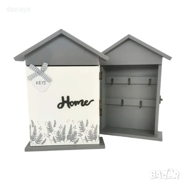 Красива и стилна кутия за ключове с надпис Home, красиво декорирана с бяло сърце, на което пише Keys. В кутията има 5 кукички за закачане на ключове и дребни аксесоари. Лесно отваряща се и затваряща вратичка.