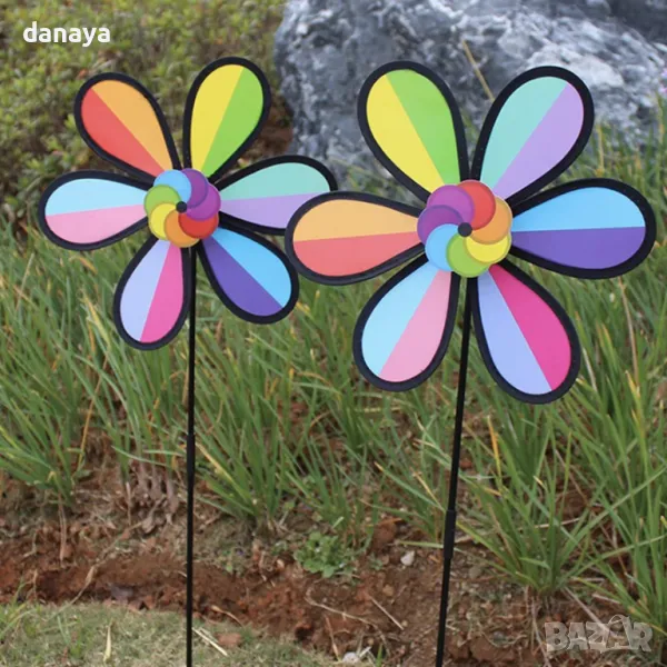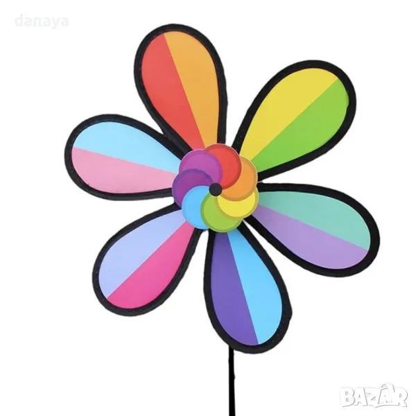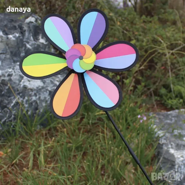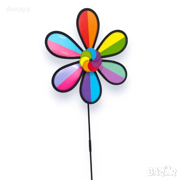 Градинска въртележка Дъга. Декорация за градина, балкони, саксии – вятърна въртележка с форма на цвете в цветовете на дъгата. Ветровъртележка в свежи ярки цветове, които ще внесат лятно настроение, където и да ги поставиш. Въртележките се въртят от вятъра. Може да я поставиш в градината като декорация, на балкона или в саксия.