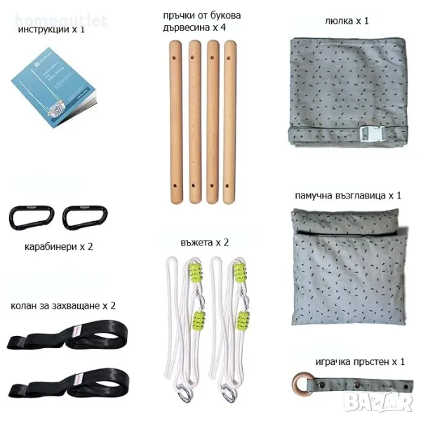Въжетата за окачване и заключващите се карабинери гарантират, че вашето дете се люлее безопасно. Дървените части са необработени и гладки.