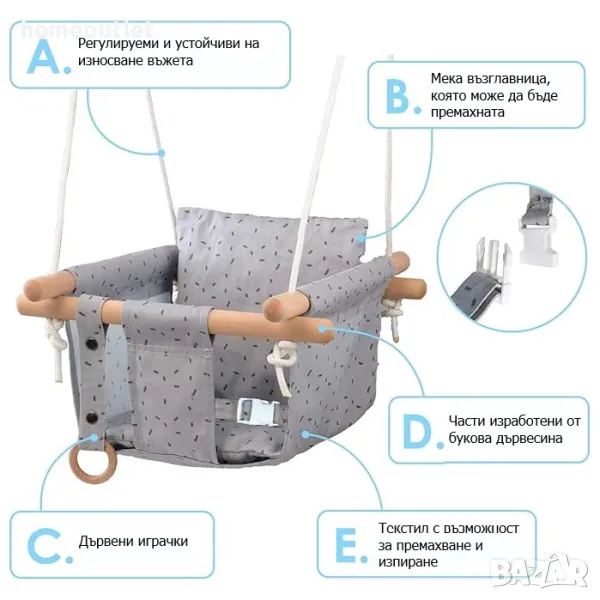 Нашата люлка е идеален избор, съчетаващ комфорт, безопасност, естествени материали и модерна визия. Тренирайте чувството на детето за баланс и физическа координация, докато се наслаждава на люлеенето!