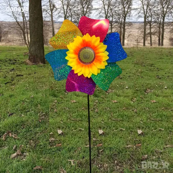 Градинска въртележка с декорация слънчоглед в центъра си. Декорация за градина, балкони, саксии – вятърна въртележка с форма на блестящо цвете и голям слънчоглед отпред. Ветровъртележка в свежи ярки цветове, които ще внесат лятно настроение, където и да ги поставиш. Въртележките се въртят от вятъра. Може да я поставиш в градината като декорация, на балкона или в саксия.