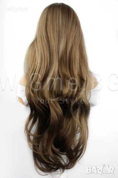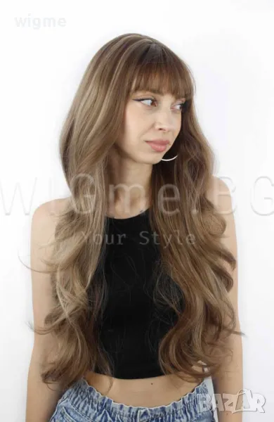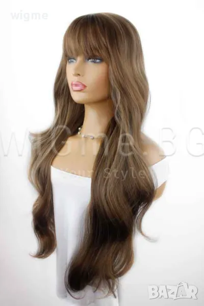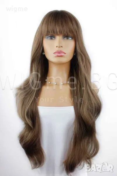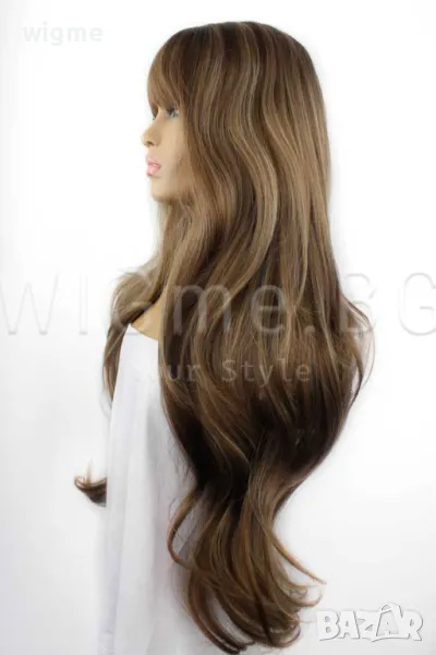 Дълга чуплива тъмноруса перука на светлоруси кичури с бретон Мирея