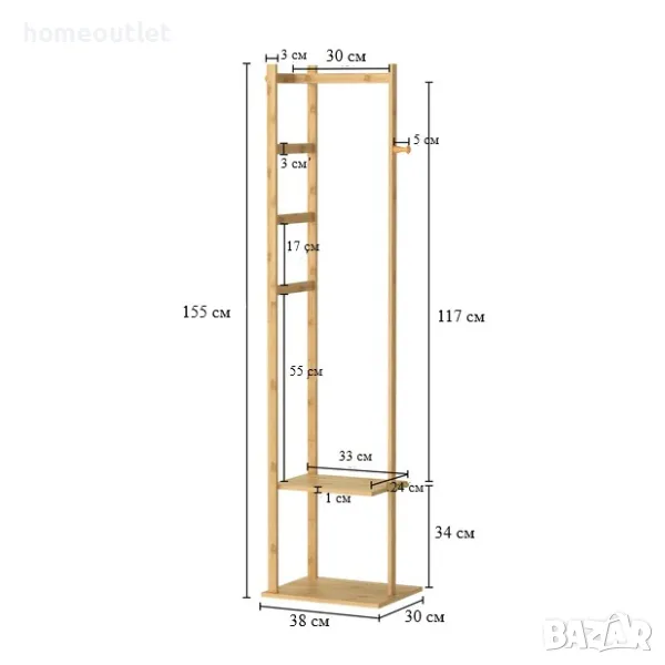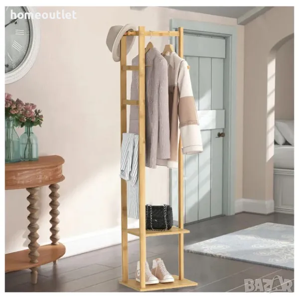 Бамбуковата етажерка е снабдена с прът за закачалки, кукичка за окачване, органайзер за панталони и рафт за съхранение. Можете да съхранявате зимните си палта, шапки, шалове, дамски чанти, обувки и др. Ако го поставите в антре или коридор, може да послужи като мултифункционална закачалка за съхранение на ежедневните ви вещи.