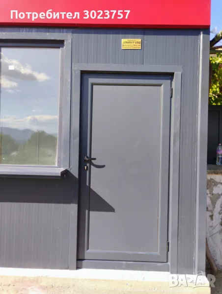-стени : сандвич панел 4см ,цвят антрацит, фасадна част -ламарина с PVC покритие с цвят по RAL. Фасадата и козирката могат да бъдат изпълнени и с еталбонд срещу доп. заплащане.