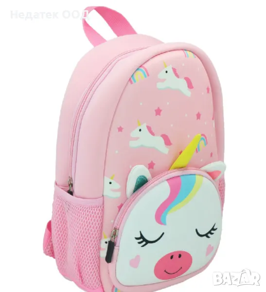 Ученическа раница за момичета в детска градина, розова с шарка на еднорог и 3D еднорог и рог. Има 1 отделение, преден джоб с цип и 2 странични джоба с мрежа. Побира всички необходими ученически пособия и прави ежедневното пътуване на детето по-лесно и забавно!