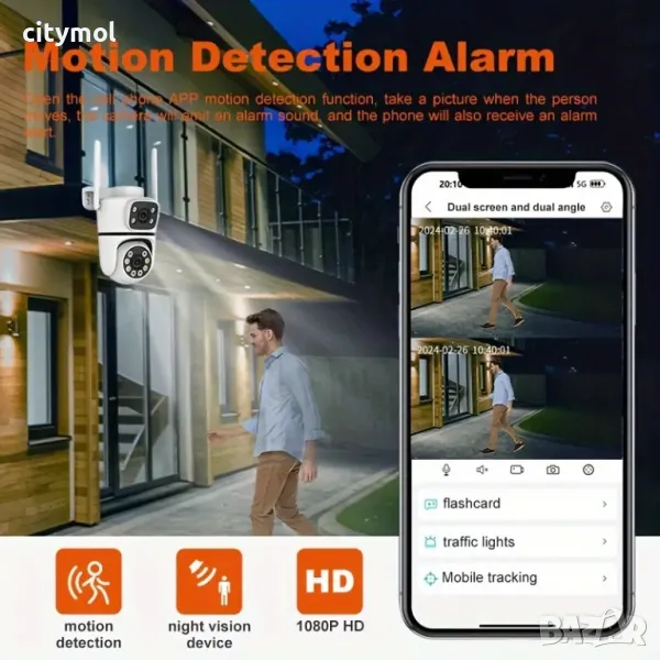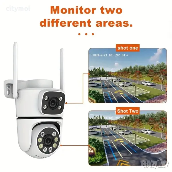 Наблюдение и управление на камерата през интеренет където и да се намирате по света с приложението за смартфон или компютър през браузера. Едната камера се позиционира и наблюдава точно определена област. А втората камера е управляема и можете да я позиционирате във всяка посока!