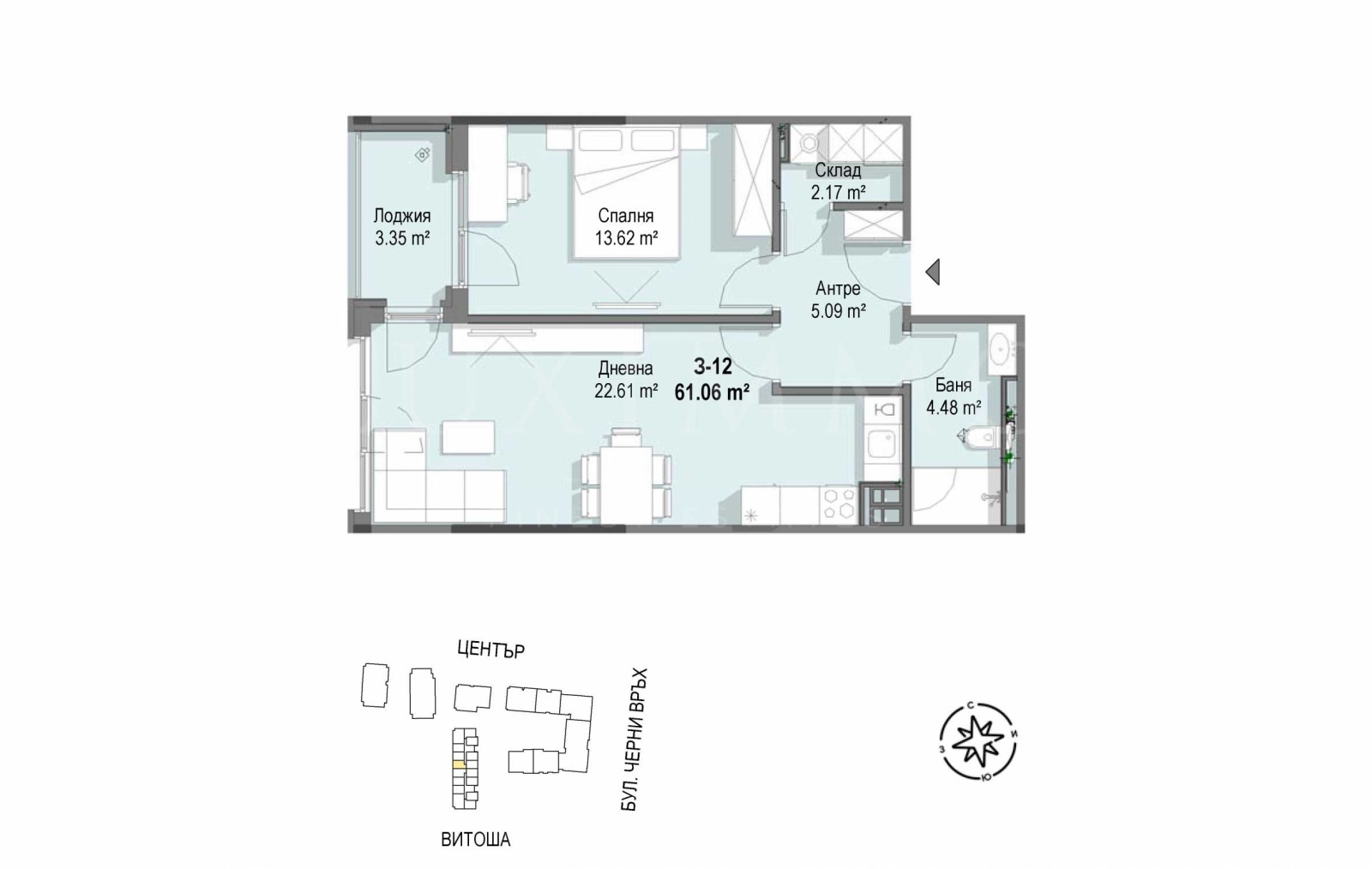 Апартаментът е функционално разпределен и предлага просторни помещения с оптимални форми. Общата площ на жилището е 71,83 кв.м., от които чистата площ е 61,06 кв.м. Разпределението включва: