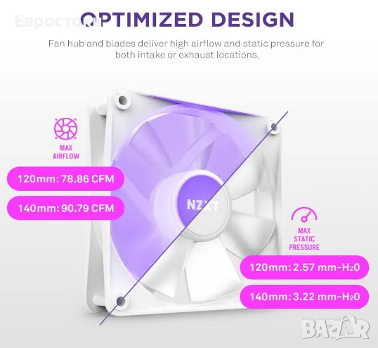 Усъвършенстваният дизайн на главината и перките предлагат подобрено статично налягане, като избутва въздух през радиатора, като същевременно осигурява страхотен въздушен поток. Това позволява превъзходно разсейване на топлината, когато е сдвоено с течен охладител или радиатор и се използва като всмукване или изпускане.