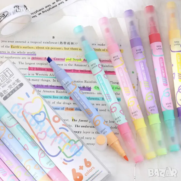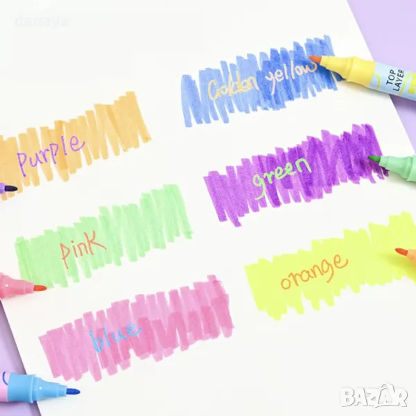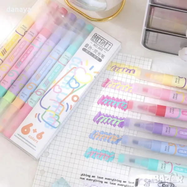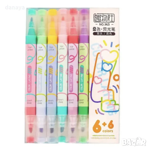 – Комплектът включва: 6 двустранни флумастери (общо 12 цвята)