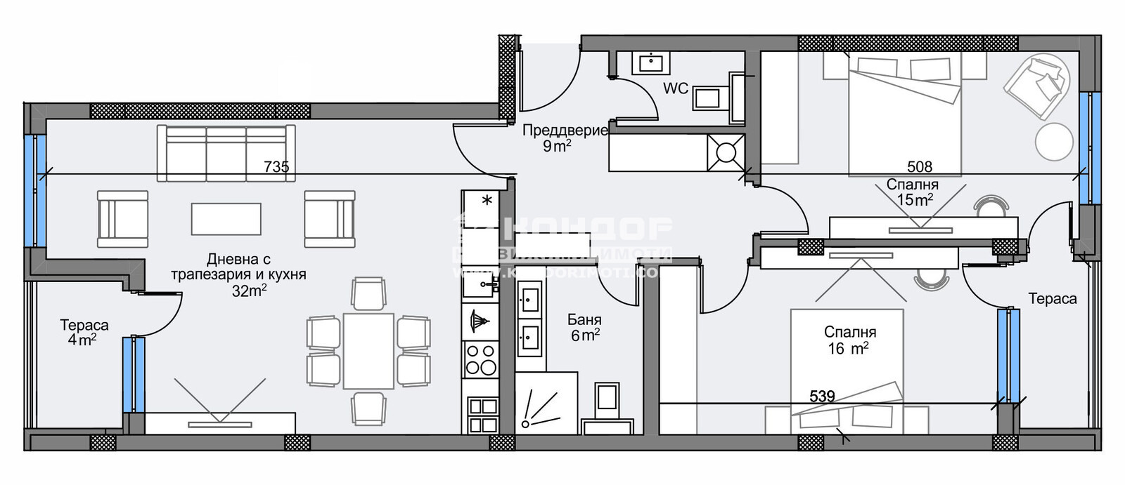Оферта 64892:Предлагаме Ви възможността да закупите стилно завършен и дизайнерски обзаведен просторен 3 - стаен апартамент в луксозен жилищен комплекс с модерна визия, проектиран да създаде максимален комфорт и сигурност на живущите в него. Основната концепция e премиум строителство, отличаващо се със съвременен архитектурен дизайн и европейска визия. Едно от основните му предимства е страхотната локация, разположен на пешеходна близост до Централна градска част. Той съчетава лукс, спокойствие и комфорт, с подсигурени подземни паркоместа. Жилището се състои от просторна дневна / 32.14 кв.м. /, трапезария и кухненска част, две големи самостоятелни спални съответно с площ от 15.63кв.м. и 15.23 кв.м., комфортна баня с тоалетна, втора тоалетна с мивка, килер с опция за перално помещение, входно антре с място за гардероб и две тераси. Основната концепция при проектирането е да се постигнат просторни и функционални стаи, с цел да се създаде максимален уют на модерното семейство. Изключителна съвременна архитектура и модерна технология на строителство. Визията е иновативна, привличаща внимание с уникалността си. Безопасна и сигурна среда за пребиваващите допълват комфорта на сградата. Всяко жилище разполага с пълно окабеляване за домофон, интернет и кабелна телевизия, общите части са луксозно завършени, жилищата са с алуминиева дограма с троен стъклопакет от най-висок клас, масивна блиндирана входна врата. Апартамента е стилно завършен и се продава напълно обзаведен с уреди и материали от най-висок клас :- Италиански поръчкови мебели по индивидуален дизайн- Кухненска конфигурация ДИАЛОГ с уреди BOSCH, LIEBHERR и осветителни тела- тапицирана спалня по италиански модел с матрак TED ERGO COMFORT- Климатична инсталация с мултисплит система DAIKIN- Телевизори SAMSUNG- Корнизи, завеси и пердета Miroxdecor. За удобство на живущите съществува възможността да закупят подземни паркоместа с топла връзка към комплекса. Възможност за закупуване чрез Банков Кредит на изключително изгодни условия за клиенти на агенцията !!!