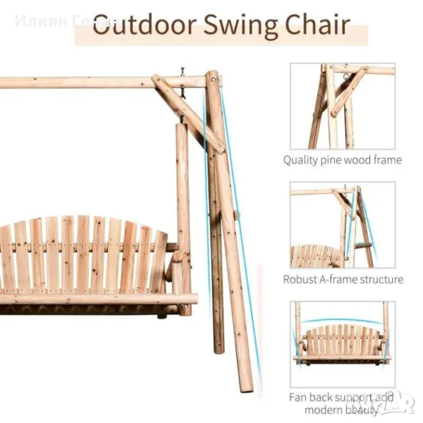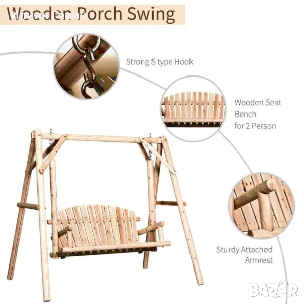 РАМКА ОТ МАСИВНО ДЪРВО: Тази люлка пейка от дървени трупи е изработена от първокласна ела с боядисана завършена повърхност, която е устойчива на вода и гниене. Дизайнът на А-рамката прави тази люлка стабилна и издръжлива, която се свързва със седалката с тежки метални куки.