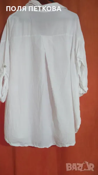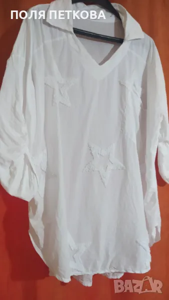 Бяла блуза памучен кенар изключително лека и удобна материя не са усеща до тялото може да се носи от размер 2/3XL италианска гръдна 140 долу в ханша се разширява до 150 см цяла дължина 78 см широк свободен модел ръкава става и за дълъг и за три четвърти
