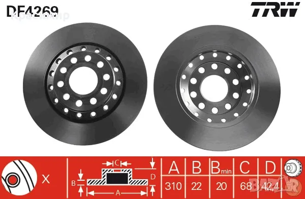 арт номер DF4269 Позиция на монтаж: Отзад | Страна на монтаж: Дясна /Лява | Външен диаметър: 310.0 mm | Дебелина: 22.0 mm | Минимална дебелина: 20.0 mm | Обща височина: 42.4 mm | Брой отвори: 5.0 бр. | Тип диск: Вентилиран | Повърхност: Боядисан | Централен отвор: 68.0 mm | Диаметър на отвор: 112.0 mm | Спирачен диск с лагер: Не | Продажна единица: 1 бр. | Цвят: Черен TecDoc данни