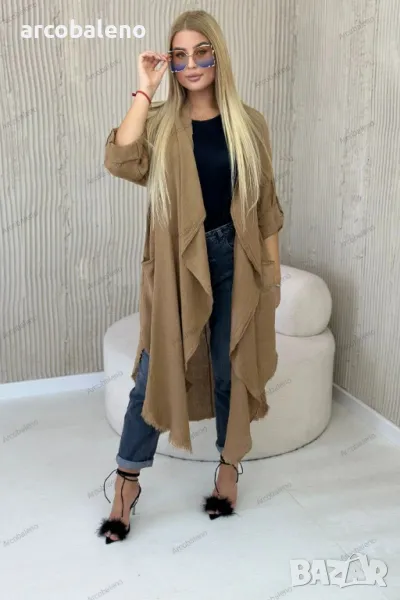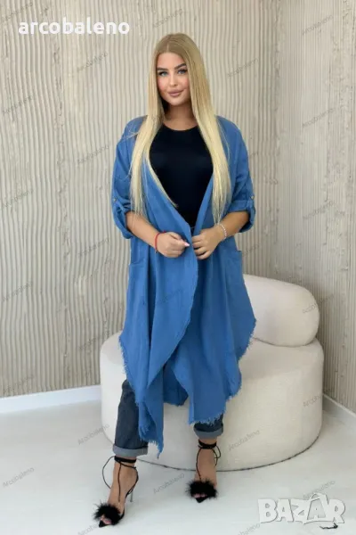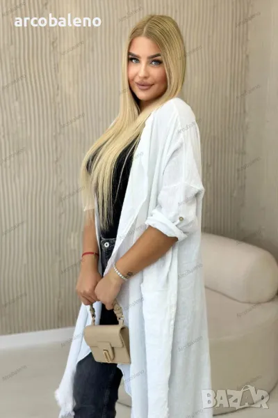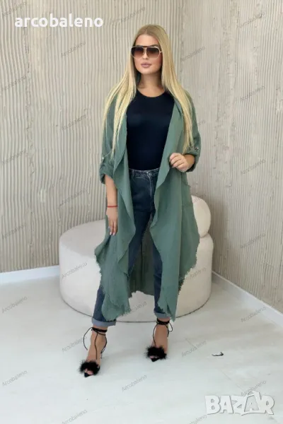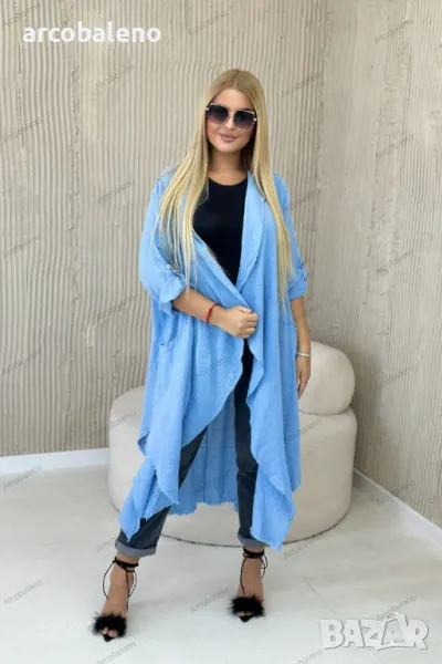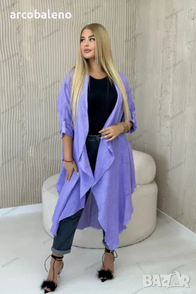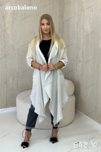 Лененото наметало е елегантен и ефирен елемент от гардероба, идеален за по-топлите дни. Изработена от естествен лен, тя осигурява комфорт и отлична циркулация на въздуха, което я прави идеална за пролетни и летни стилове. Лека и ефирна, тя е перфектна както за разходки по плажа, така и за небрежни излети в града. Универсалният му дизайн позволява лесно съчетаване с различни елементи на гардероба, добавяйки стил и свобода към всеки тоалет. Лененото наметало е задължително за всяка жена, която цени естествените материи и елегантния, но същевременно небрежен стил. Размерът е универсален и ще бъде подходящ за жени, носещи размер S, M или L.