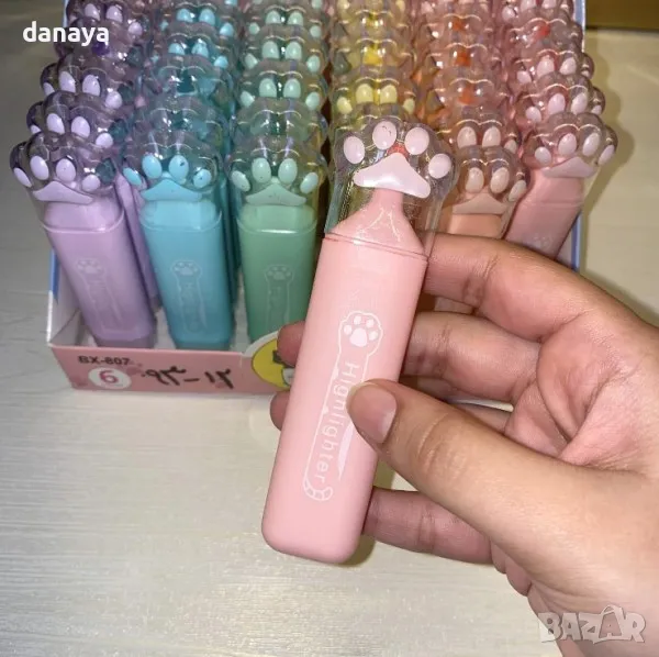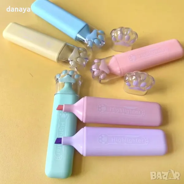 Цветни маркери за подчертаване с капачка с формата на лапичка. С помощта на маркерите ще можеш да отбележиш най-важното в твоите бележки и записки. Скосен връх, който позволява да правиш тънки и дебели линии. Маркерите са подходящи за всички видове хартия, дори и за факс, а мастилото им изсъхва незабавно.